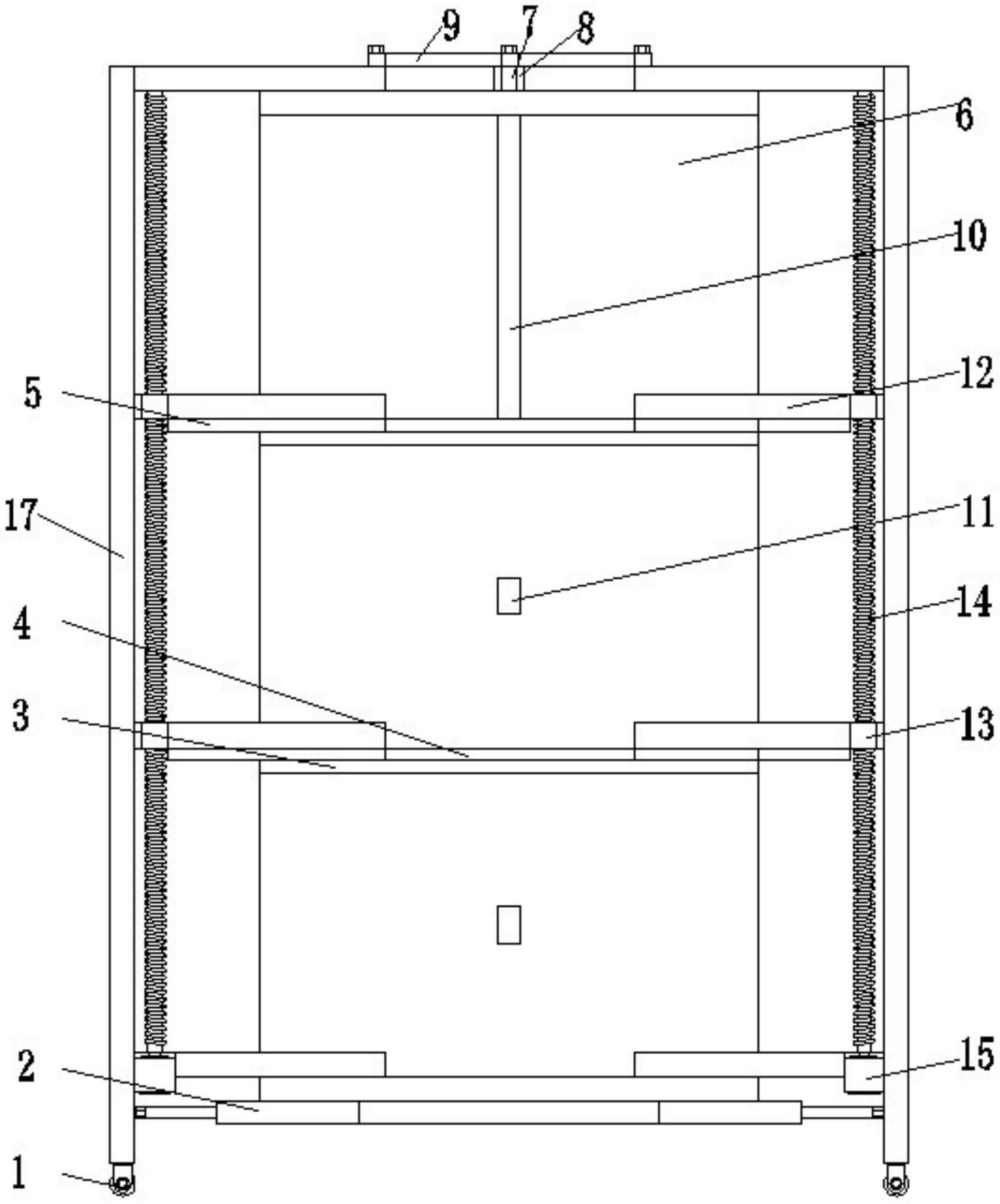 本实用新型公开了一种一种层间距方便调节的货架,包括货架主体,所述货架主体的内部设置有若干个支撑横板和隔板,所述货架主体的左右两侧均设有侧架,所述侧架的底部连接有两个滑轮,所述货架主体的的左右两侧设置有液压油缸,所述侧架的内部设置有若干个水平设置的台板,所述台板的端部嵌入有丝杆套柱,所述丝杆套柱的内部穿设有支撑丝杆,所述支撑丝杆的输入端连接有丝杆电机,所述支撑横板的内部开设有滑槽。本实用新型经丝杆电机的作用,可通过支撑丝杆推动丝杆套柱移动,以及丝杆套柱与台板固定连接,可改变丝杆套柱与台板的高度,并可将台板调节至合适的位置,可为货品提供不同的放置位置。