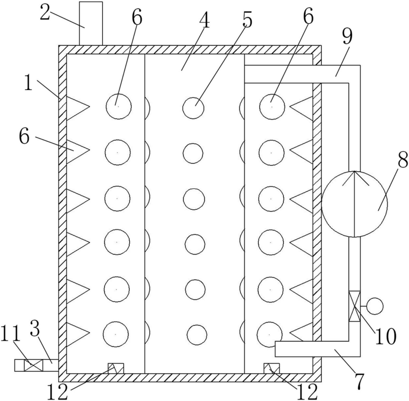 一种内循环高效破碎式植物成分提取装置,包括壳体、与壳体连通的进料管、与壳体连通的排液管,其特征是,所述壳体为长方体状壳体,壳体的中央设置有喷淋筒,喷淋筒固接于壳体的顶壁和底壁之间,喷淋筒上开设有多个喷淋孔;壳体的四个内壁上固接有多个锥钉,壳体的底部插入吸入管,吸入管的开口置于壳体内且位于喷淋筒外,吸入管与循环泵连通,循环泵的出口管穿过壳体与喷淋筒的上部连通。