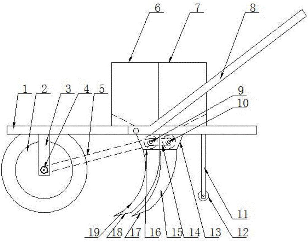 本实用新型涉及一种用于颗粒剂施用的种药肥同播设备,包括手推车及播种机构,手推车包括车体、行走轮及推杆,播种机构包括种子料槽、种子出料阀及种子下料管,其还包括药肥机构,该药肥机构包括药肥料槽、药肥出料阀及药肥下料管,药肥料槽安装于手推车的车体上并位于种子料槽的前部,药肥料槽下部连接安装药肥出料阀,药肥出料阀下部连接安装药肥下料管,药肥下料管的出口端紧邻于种子下料管的前部;行走轮的轮轴通过链条传动机构与所述药肥出料阀的轴杆联动,药肥出料阀的轴杆通过链条传动机构与种子出料阀的轴杆联动。本实用新型结构设计简洁,科学合理,操作省时省力,方便快捷,可实现种药肥同播,适用粒径范围大,操作简单,避免二次施药。