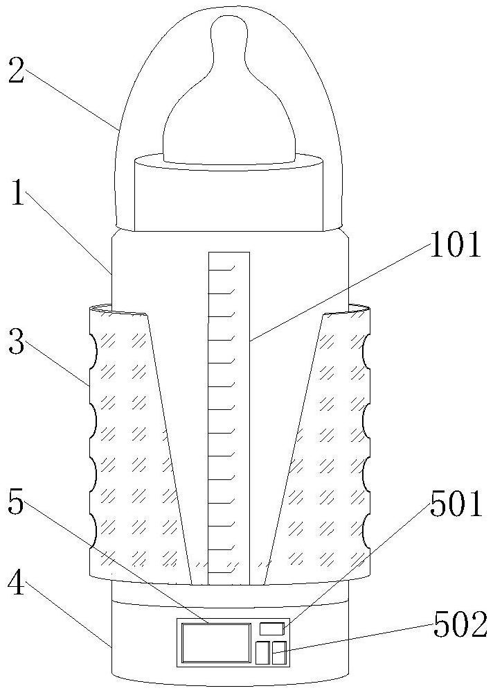 本实用新型属于奶瓶技术领域,尤其为一种具有自动搅拌和温度智能显示的奶瓶,包括包括奶瓶本体,所述奶瓶本体的上端面安装有防尘罩,所述奶瓶本体的底端面连通有底座,所述底座外侧壁的前端嵌入安装有显示屏,所述显示屏的右侧从上至下依次设置有启动按钮和两个并列的控制按钮,所述启动按钮和两个控制按钮均安装于底座的外侧壁,所述启动按钮和两个控制按钮均与显示屏电性连接,从而通过在显示屏上设置搅拌的时间,使得电机带动搅拌杆将奶瓶中的溶液在设定的时间内进行搅拌,进而达到计时自动搅拌的效果,通过在显示屏上设置奶瓶中溶液的温度,温度传感器监控溶液上升的温度,进而达到自动控制温度和智能显示温度的效果。