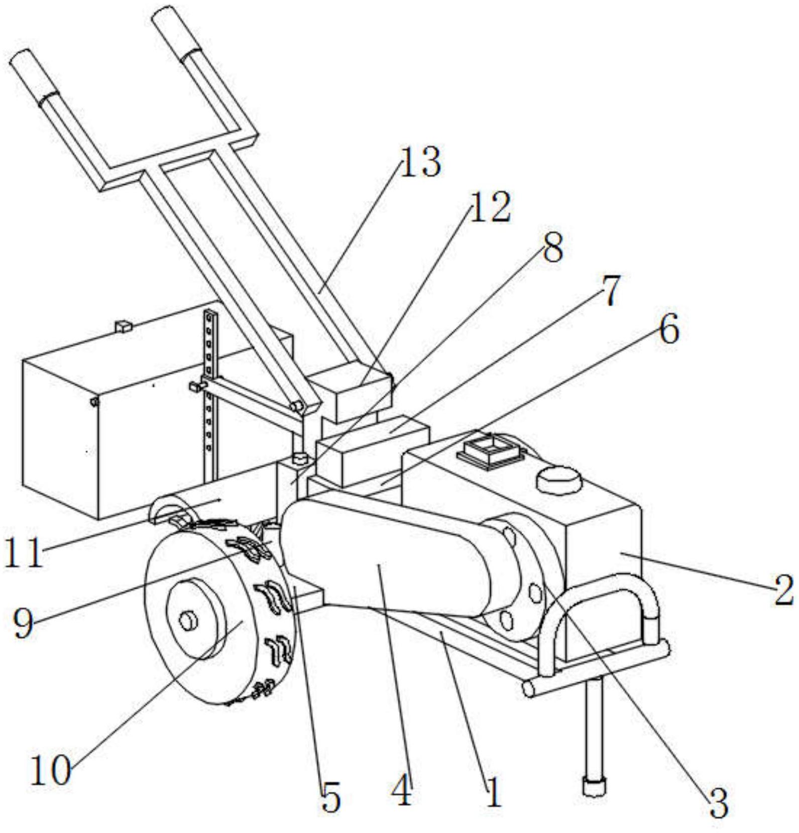 本实用新型涉及微耕机技术领域,具体涉及一种带除草刀的微耕机,包括前车架、后车架、蓄电池、水箱、水泵、固定插销和肥料箱,所述后车架上端中部固定安装有传动箱,所述传动箱上端固定安装有蓄电池,所述后车架上端左部固定安装有水箱。本实用新型克服了现有技术的不足,通过设置肥料箱、网状筛和料箱盖,人员在使用微耕机除草翻土时,通过在装置后端设置肥料箱,人员可打开料箱盖,然后将肥料装入肥料箱内,再将料箱盖合上,此时将活动扣插入到固定扣内,再通过固定插销将固定扣与活动扣固定,从而装置在运行时,防止肥料从肥料箱上端抖出,而在当人员使用装置前进时,装置会产生抖动,此时肥料会从肥料箱下端的网状筛抖出。
