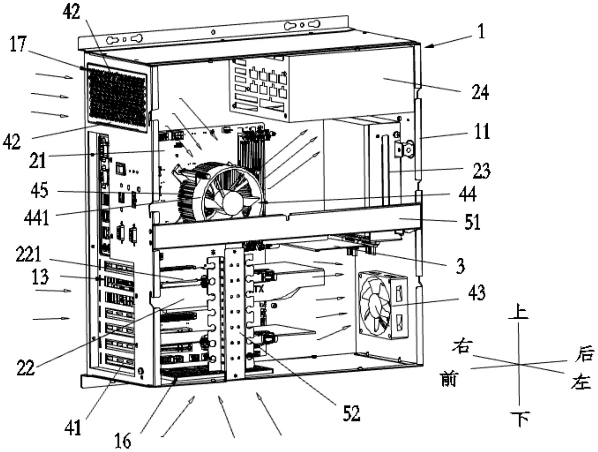 本实用新型提供一种分区散热式工控机,包括:机箱、第一发热部件、第二发热部件和导风罩;第一发热部件、第二发热部件和导风罩均位于机箱内;机箱的表面开设有第一出风口和第二出风口;第一发热部件和第二发热部件分别位于导风罩的相对两侧,第一出风口和第二出风口分别位于导风罩的相对两侧,第一发热部件和第一出风口均位于导风罩同一侧,第二发热部件和第二出风孔均位于导风罩的同一侧;导风罩位于第二发热部件中朝向第二出风口的一侧;导风罩用于阻挡从第二发热部件排出的风通过第一出风孔排出机箱。本实用新型能够提高第一发热部件的散热效率。