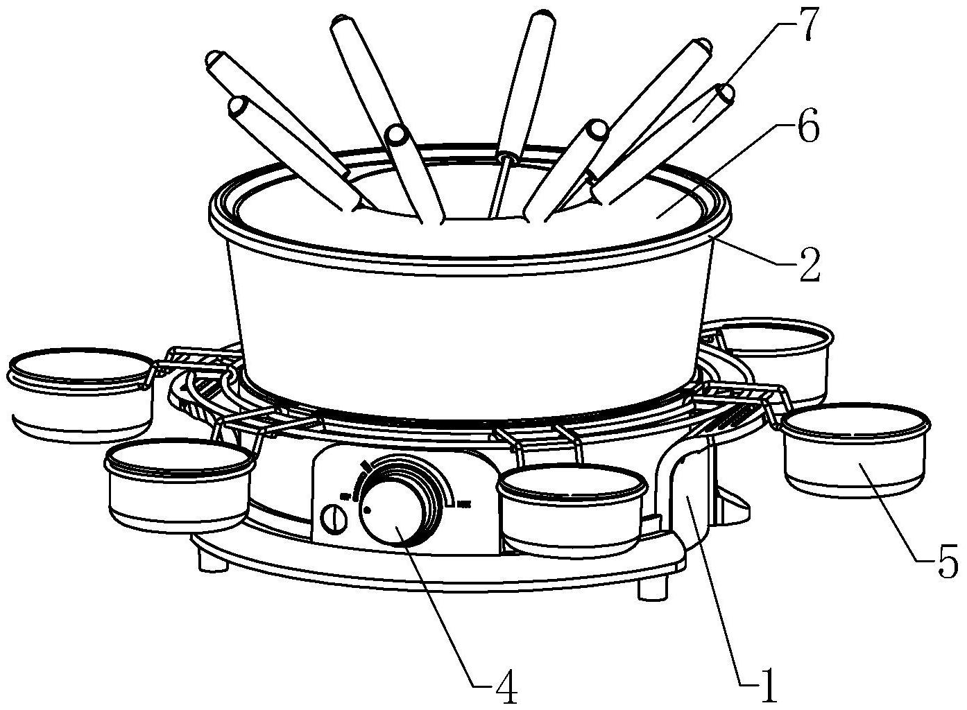 本发明创造公开了一种火锅炉,包括有底座,底座上设置有用于加热锅体的加热组件,加热组件电连接有温控装置,底座上设置有若干环绕分布在锅体外侧的小锅,底座上设置有套设于锅体外侧的环形支架,环形支架上环绕分布有若干固定环,若干小锅对应地放置在固定环中;若干小锅可以用来放置多种用户准备的食材或佐料,还可以用来放置锅体煮熟后的食材;因此,用户不在需要准备过多的容器来放置食材或佐料,这样可以节省大量的使用空间,同时也方便用户使用放置在小锅中的食材或佐料。