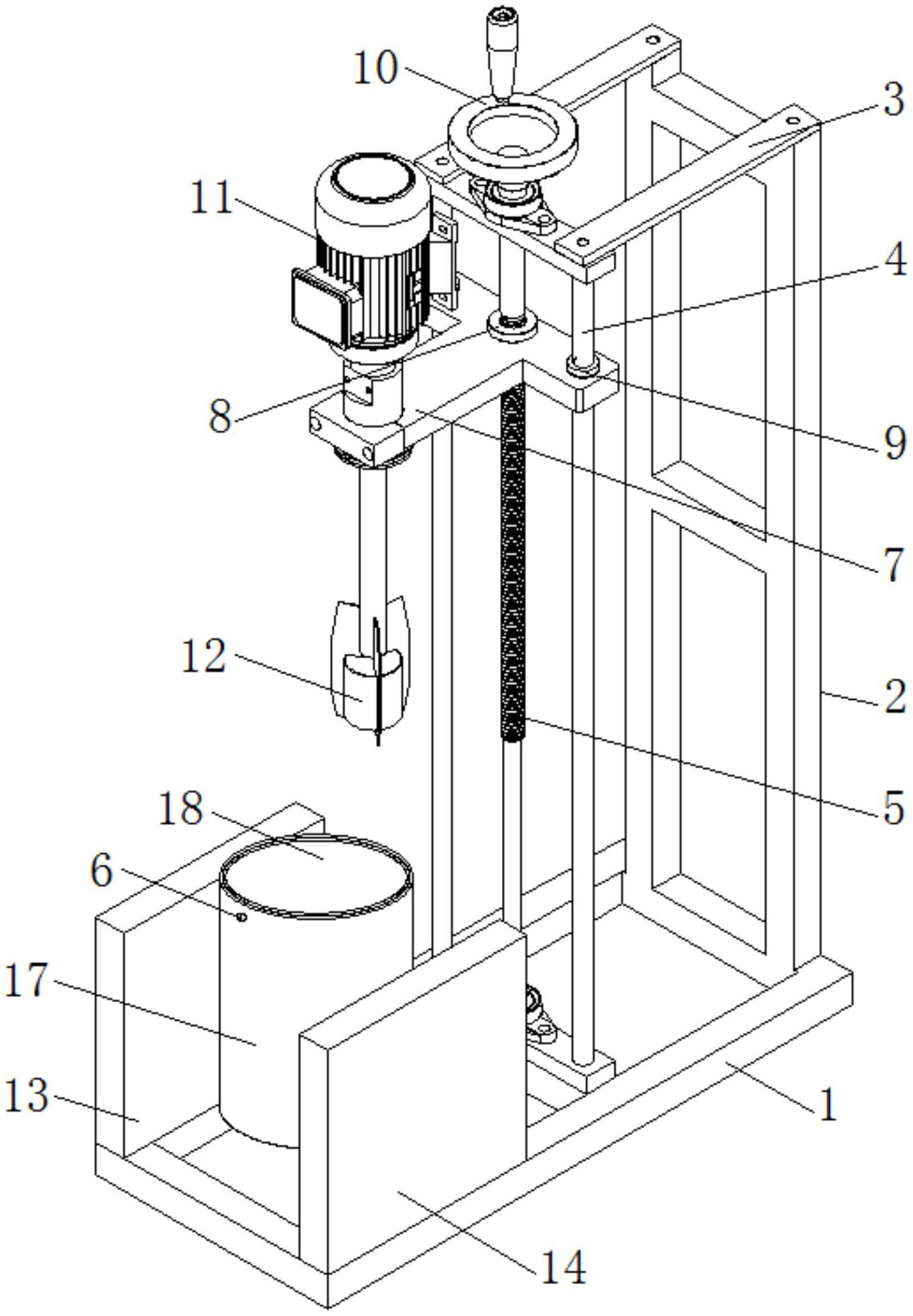 本实用新型公开了一种用于饮料调配的高剪切搅拌设备,包括底架,所述底架上端面的后侧固定安装有纵架,所述纵架的上端面固定安装有顶架,所述纵架与顶架之间固定安装也导向杆,所述纵架与顶架之间通过轴承安装有螺纹杆,所述导向杆和螺纹杆的外部设置有升降座,所述升降座与导向杆之间设置有导向套。该用于饮料调配的高剪切搅拌设备,升降座升降调节简单,且调节速度快,无需电力驱动,以及提高升降的稳定性;通过设置的内胆对饮料进行盛放,内胆为可拆卸结构,便于拆卸清洗,且在对饮料剪切搅拌完毕之后,通过驱动电机二带动搅拌桶旋转一定角度,对饮料进行下料,下料速度快,且下料彻底、轻松,饮料残留极少,便于使用。