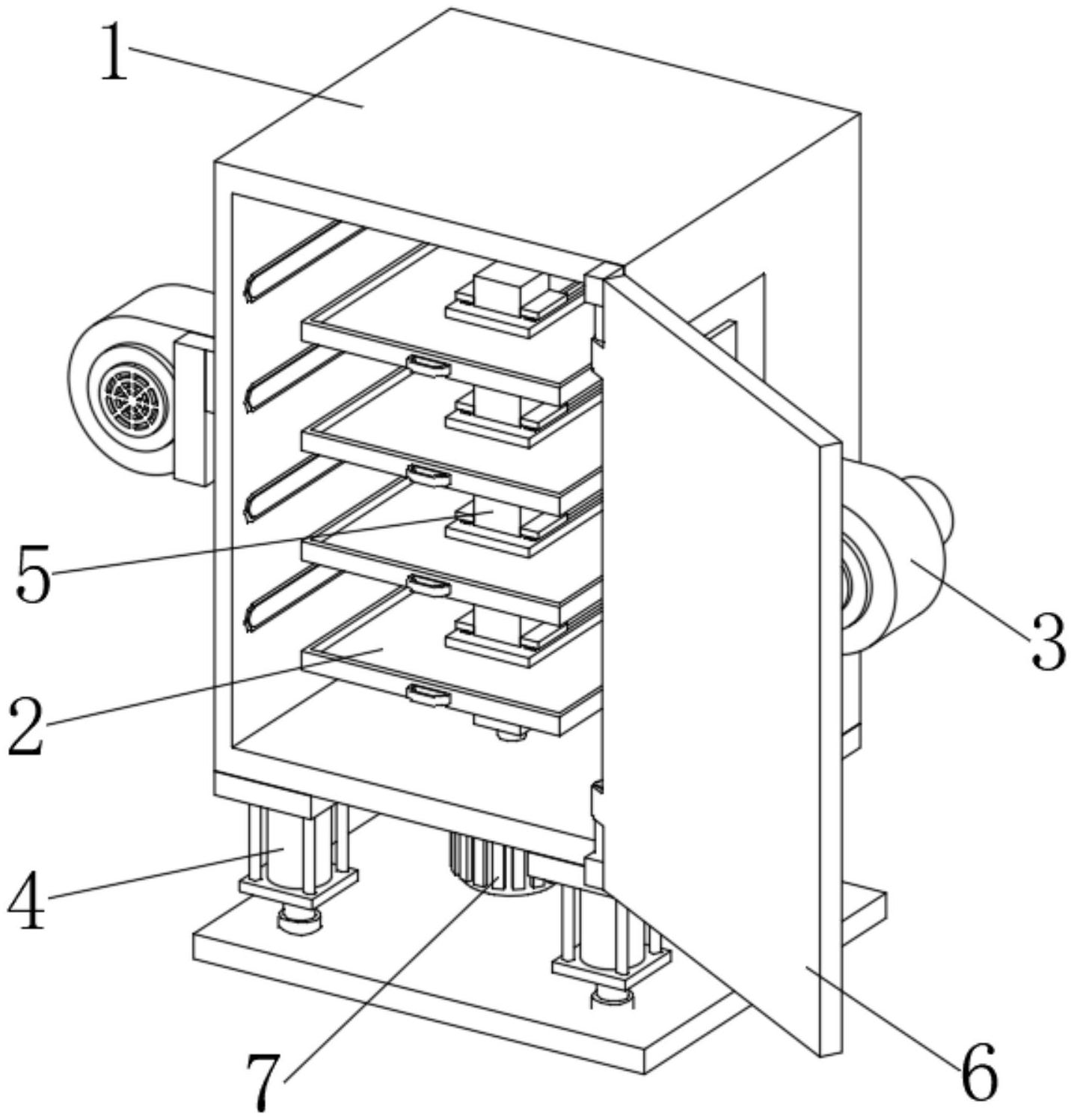 本实用新型公开了一种糕点生产用糕点冷却装置,包括风冷箱体,所述风冷箱体下端左部和下端右部共同安装有支撑装置,所述风冷箱体左端中部和右端中部均安装有风冷装置,所述风冷箱体下端中部安装有电机,所述风冷箱体下内壁中部安装有支撑柱,所述支撑柱外表面安装有四个旋动储放装置,所述风冷箱体前端右部安装有柜门。本实用新型所述的一种糕点生产用糕点冷却装置,通过旋动储放装置不仅方便糕点进行拿取包装,同时也可对糕点托盘进行清理,防止其内会有碎屑,通过电机带动支撑柱和糕点托盘进行旋动,同时再由风冷装置上的风机进行吹风,使糕点托盘上的糕点能够均匀的吹风,进而提高了糕点的冷却效率。