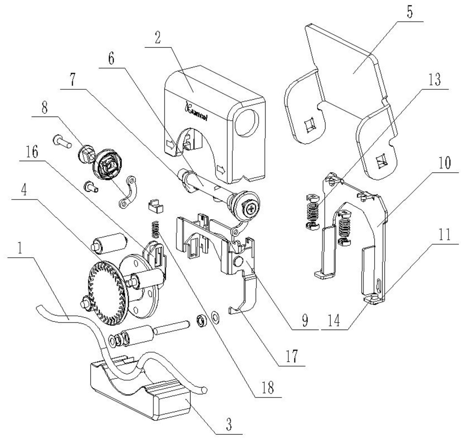 本实用新型公开一种用于高压力蠕动泵的快速换管结构,换管时间短,几乎不影响使用效率,终端用户体验好;泵座和扣壳的外侧设置有翻盖,翻盖活动卡接在驱动转轴上,通过翻转翻盖带动驱动转轴转动,驱动转轴上对称设置有两个偏心板,每个偏心板上均设置有连杆,连杆均呈弧形结构,且两个连杆的一端对应铰接在偏心板上,两个连杆的另一端分别铰接在钣金组件上,钣金组件通过连杆随驱动转轴上下动作;钣金组件一侧设置有扣壳支架,扣壳支架的下端朝向钣金组件的一侧设置有横向凸出的插脚;扣壳朝向钣金组件的一侧设置有插接孔,插脚能匹配的设置在插接孔内,通过钣金组件带动扣壳支架上下动作驱动扣壳上下动作,使得泵管被夹紧或松开,方便更换泵管。