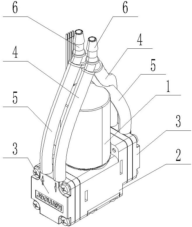 本实用新型克服了现有技术存在的不足,提供了一种用于气体采集的双泵头隔膜气泵,采用双泵头结构,流量更稳定,噪音更小,功率更小,振动更小;为了解决上述技术问题,本实用新型采用的技术方案为:一种用于气体采集的双泵头隔膜气泵,包括驱动电机和隔膜泵本体,所述驱动电机的动力输出端伸入到隔膜泵本体内,所述驱动电机的动力输出端垂直设置在隔膜泵本体的中部,所述隔膜泵本体为双泵头结构,所述隔膜泵本体两端均设置有阀上板,两个所述阀上板的进出口分别并联在一起;本实用新型可广泛应用于隔膜气泵领域。
