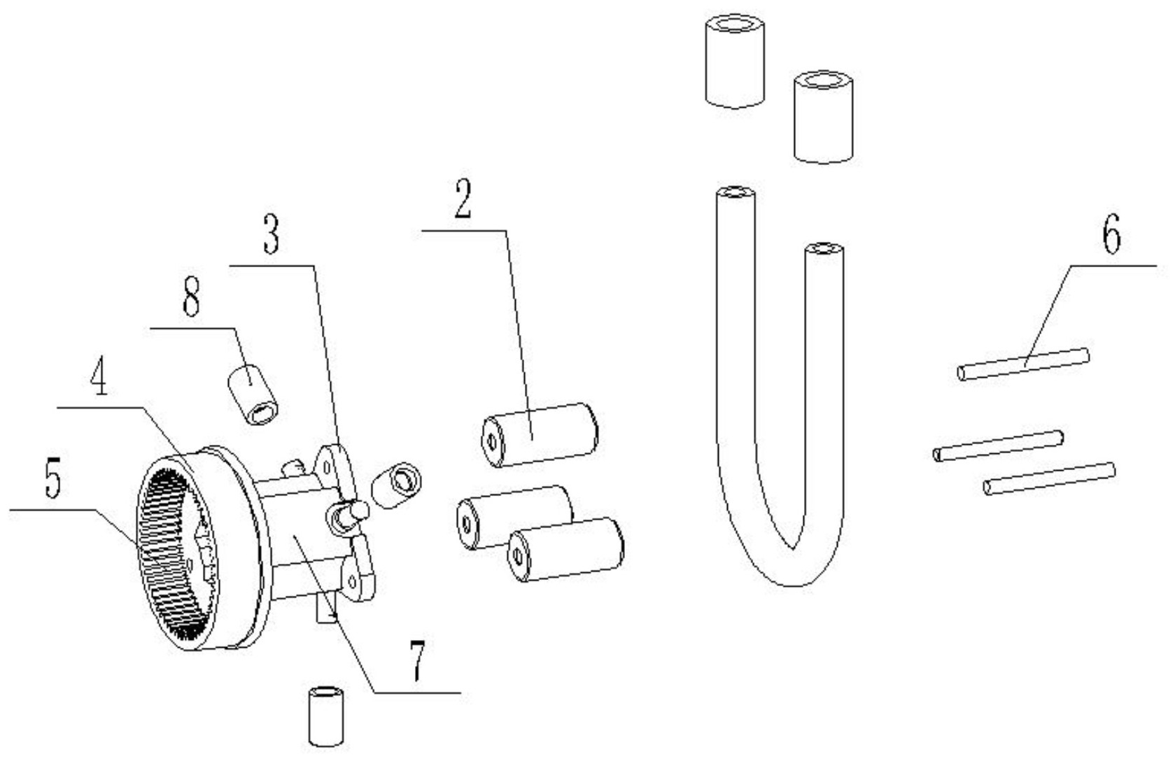 本实用新型公开一种防止泵管跑管割管的同步盘结构,省去中间连接支架,同步盘与内齿圈一体加工成型,动力传递效率高,几乎没有运行噪音,采用可自转的限位管约束泵管,避免了泵管的割管和跑管同步盘本体包括三个圆周阵列分布的套管,三个套管的一端均固定设置在固定板上,三个套管的另一端固定设置有齿轮箱体,齿轮箱体的封闭端与套管的端部连接,齿轮箱体内设置有环形的内齿圈,齿轮箱体能与套管同步转动,齿轮箱体内的内齿圈与动力输出端的行星齿轮能匹配的啮合在一起,齿轮箱体的封闭端与固定板之间设置有固定座,固定座位于三个套管形成的环内,位于相邻的两个套管之间的固定座上均设置有限位滚轴,限位滚轴的高度不低于齿轮箱体的外侧面。