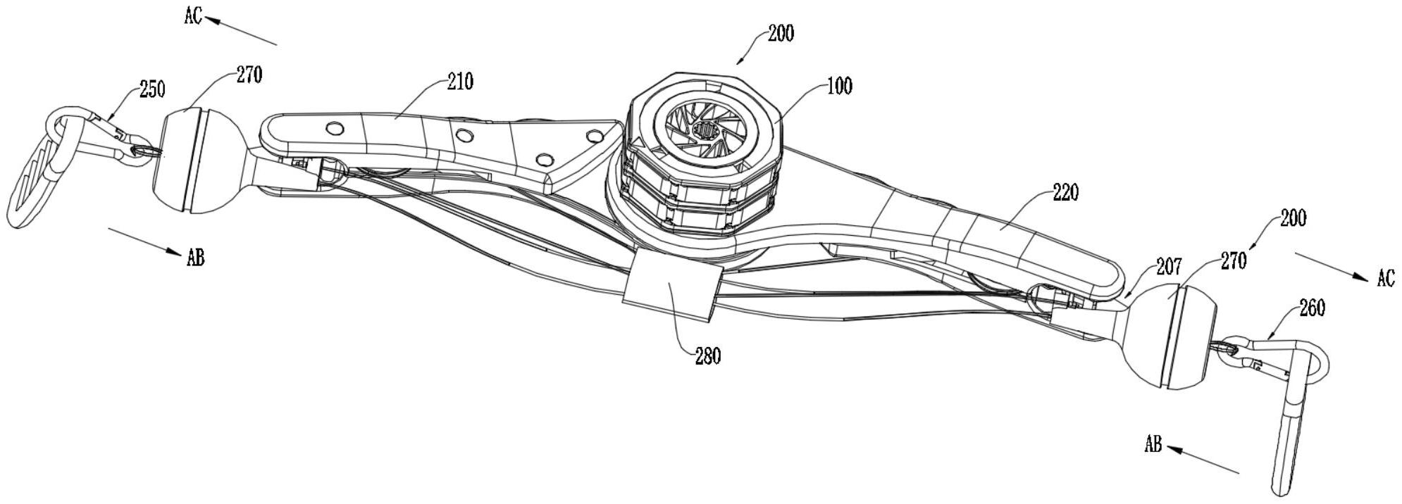 本实用新型提供一种阻力可调的健身器材。其包括:第一旋臂,具有近端和远端。第二旋臂枢接于第一旋臂的近端。第一拉动件,配置第一旋臂的远端用于朝向第一旋臂的方向拉动第二旋臂。第二拉动件,配置第二旋臂的远端,用于朝向第二旋臂的方向拉动第一旋臂。阻力调节件,接合至第一旋臂和第二旋臂,且在第一旋臂和第二旋臂相向运动时,抵抗第一旋臂远端向第二旋臂远端的枢转运动。本申请的健身器材能够通过阻力调节机构调节第一旋臂和第二旋臂相向旋转的阻力,具有良好的健身效果。