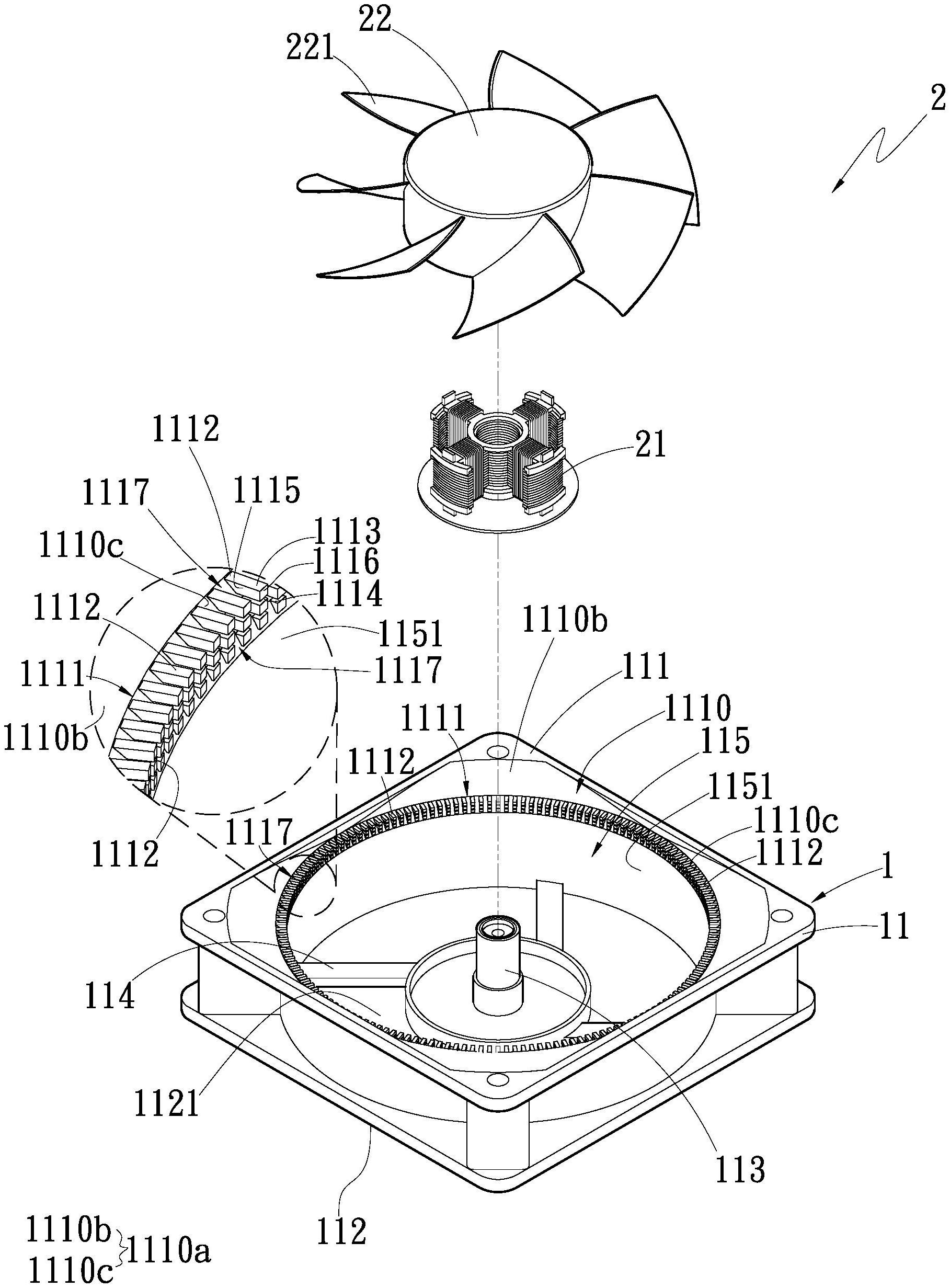 本实用新型涉及一种风扇框湍流结构,包括一框体具有一进风侧及一出风侧分别设在该框体的两侧,且在该框体中间处具有一气流通道由该进风侧贯穿至该出风侧,且该气流通道具有一通道内壁连接该进风侧及该出风侧,该进风侧具有一入口连通该气流通道,该入口具有一碎化区位于该进风侧与该通道内壁之间,该碎化区包括多个密集分布的细碎化单元,该多个细碎化单元之间形成多个间隙连通该气流通道,借由该多个细碎化单元打碎从该进风侧吸入的一气流,使该气流的一部分通过该多个细碎化单元之间的间隙碎化分散成间隙湍流进入该气流通道中,借以实现降低宽带带噪音的效果。