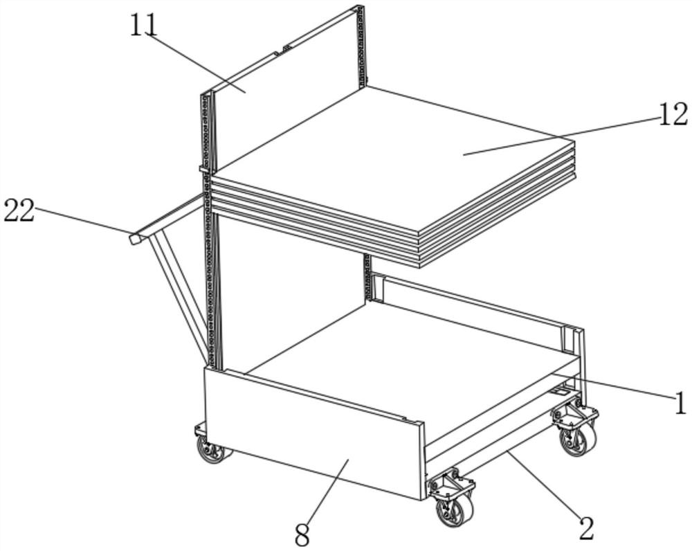 本实用新型涉及物流发送技术领域,尤其涉及一种区块链电子商务产品物流发送辅助装置,包括支撑板,所述支撑板的底部设置有移动机构,所述支撑板一侧上方竖直连接有扶手,所述支撑板靠近扶手一侧上表面竖直连接有安装板,所述安装板的一侧设置有多个分隔机构且另一侧设置有调节机构,所述分隔机构包括水平滑动连接在安装板一侧的分隔板。本实用新型通过设置调节机构,在分隔机构和固定机构的相互配合下,实现了对产品的分层放置,使得产品不需要全部堆积在支撑板上,从而增加了物流发送过程中,产品的稳定性,避免在转运的时候,产品从该装置上掉落,避免产品掉落对周围的工作人员造成伤害,从而增加了该装置的安全性,使得物流发送时更加安全。