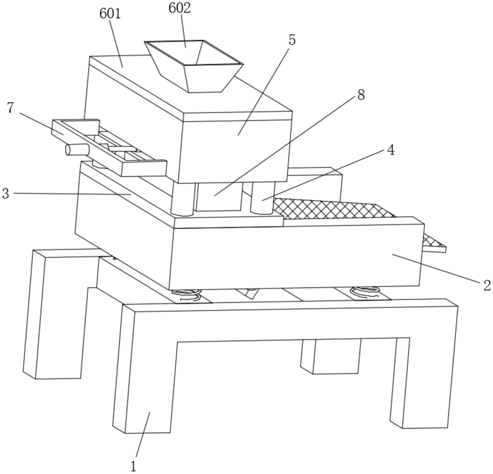 本实用新型公开了一种生产清洁剂用分散机,涉及分散机技术领域。包括工作台,所述工作台顶端设置有震动装置,震动装置顶端一侧固定有固定板,固定板上开设有第一物料口,固定板顶端固定有多个立柱,立柱顶端固定有分散箱,分散箱内设置有分散装置,分散箱顶端固定有顶盖,顶盖顶端固定有进料斗,分散箱底部开设有第二物料口,第一物料口和第二物料口之间固定有物料道。本实用新型设置有分散装置和震动装置,将物料投入分散箱中,通过电机带动搅拌杆和搅拌叶片转动,实现对物料的初步分散,然后开启物流口启闭装置,物料通过物料道进入到震动装置中,物料在物料滑板上震动滑落,从而实现物料的充分分散,该装置结构简单。