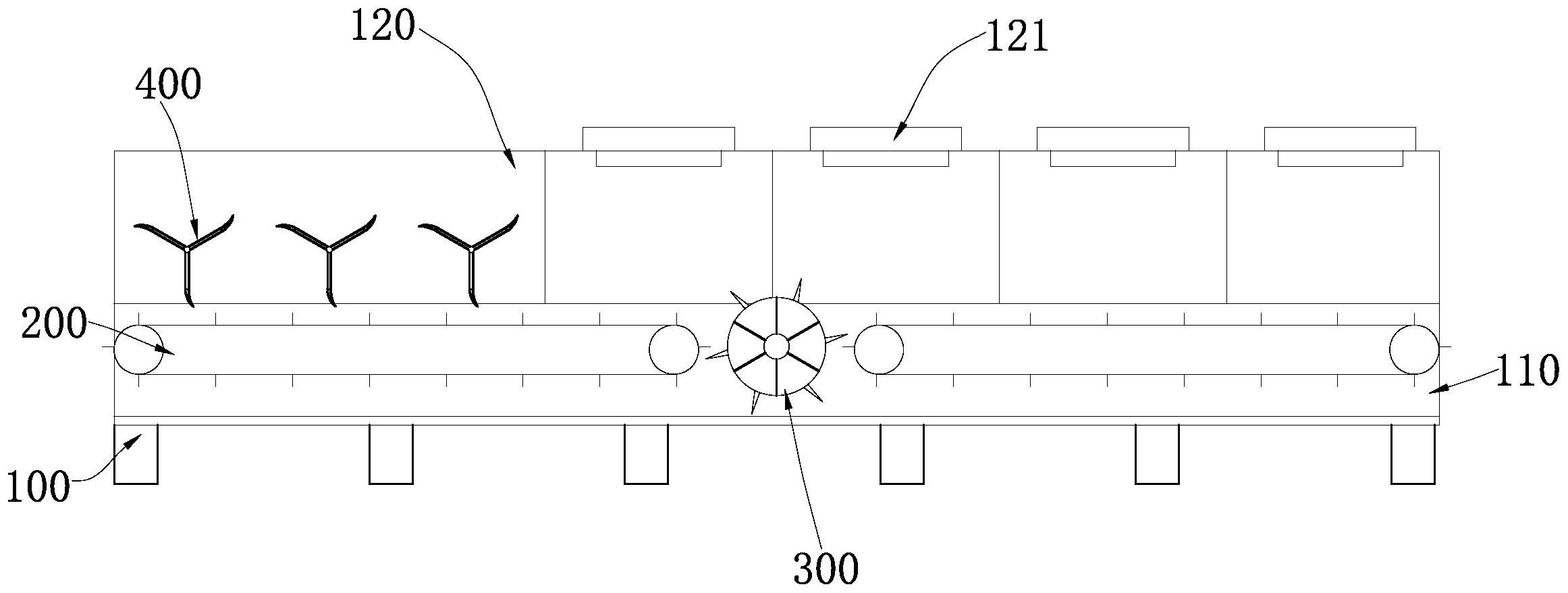 本实用新型公开了一种食品加工设备,尤其涉及一种均匀烘干装置,包括机架,机架上设置有箱体,箱体内设置有将木耳自箱体的一端输送至另一端的输送机构,箱体上设置有对木耳进行加热的加热装置,输送机构包括至少两个输送带,相邻的两个输送带之间设置有翻转机构,翻转机构包括置于两个输送带之间的可转动的翻转轮,翻转轮上设置有翻转板,前一输送带的木耳输送至翻转板,翻转轮转动带动翻转板转动并将木耳翻转后输送至后一输送带上。通过翻转板的转动使木耳在两个输送带之间移动,在转动时木耳能够翻面,从而使木耳能够均匀受热。