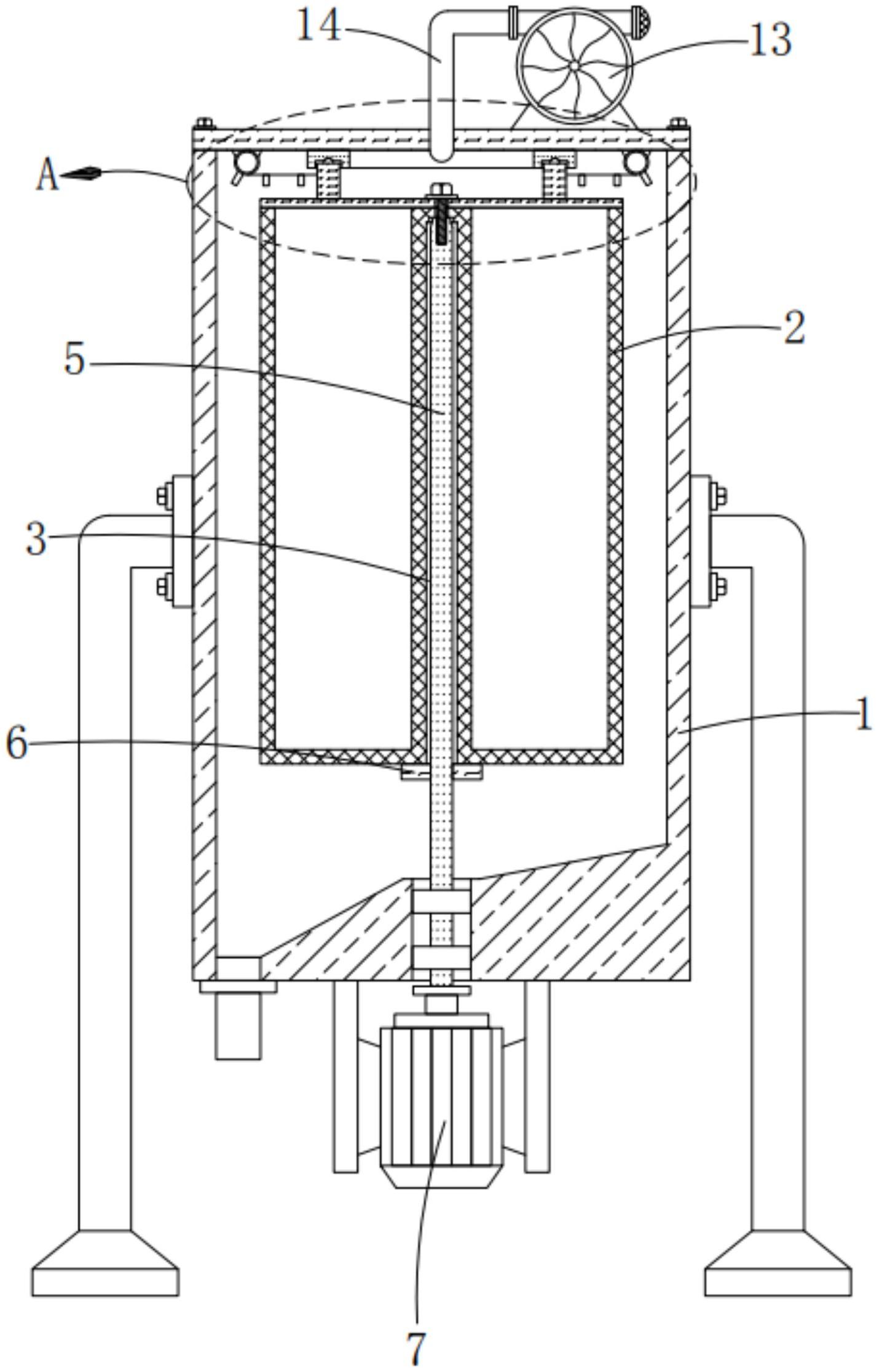 本实用新型提供一种植物提取物分离离心装置。所述植物提取物分离离心装置包括箱体;网框,所述网框设置在所述箱体内;安装口,所述安装口开设在所述网框上;嵌槽,所述嵌槽开设在所述安装口的顶部内壁上;传动杆,所述传动杆转动安装在所述箱体的底部内壁上,所述传动杆的顶端延伸至所述嵌槽内,所述传动杆贯穿所述安装口,所述传动杆的底端延伸至所述箱体外;限位环,所述限位环固定套设在所述传动杆上,所述限位环的顶部和所述网框的底部相接触。本实用新型提供的植物提取物分离离心装置具有便于清理残渣、提高汁液流动性、提高收集效率、且清理较为方便的优点。