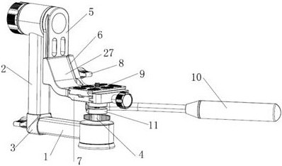 本实用新型涉及一种新型悬臂式云台,包括悬臂主体,悬臂主体的上端安装有旋转臂组件,旋转臂组件的下部安装有板座,板座自由端的上部安装有快装板,板座自由端的下部安装有把手组件,把手组件包括把手、连接座和把手锁紧旋钮,连接座内开有供把手一端插入的安装通孔,连接座上设置有水平布置的第一剖口、与第一剖口平面相垂直的孔以及旋入该孔的第一螺杆,第一剖口与安装通孔连通,第一螺杆的下端安装有把手锁紧旋钮,第一螺杆的上端与板座底部相连,连接座上端围绕着第一螺杆布置有一圈下齿牙,板座的下端设置有一圈与下齿牙相配的上齿牙。本实用新型结构简单、具有多个可调功能。