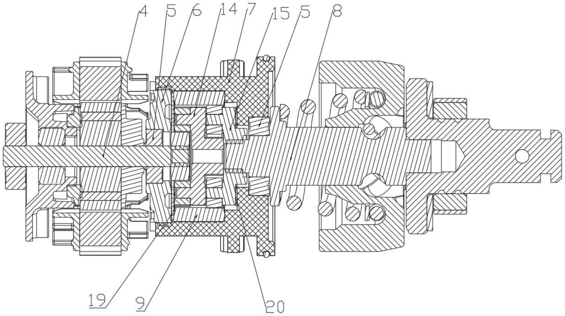 本实用新型的目的是提供一种电扳手的动力传输结构,其组成包括:打击块组件、双层行星齿轮组组件和马达组件,其特征在于:所述双层行星齿轮组组件包括牙箱和后牙箱盖,所述牙箱后端与后牙箱盖连接,并在牙箱内部形成一个腔体,所述牙箱内部连接有内齿圈,所述内齿圈内部连接有行星组件A和行星组件B,所述行星组件A连接在行星组件B后方;所述行星组件A包括行星轴架A,所述行星轴架A前侧设有大齿轮,后侧设有三个或三个以上行星齿轮轴,所述行星齿轮轴上套设有行星齿轮A;所述行星组件B包括行星轴架B,所述行星轴架B后侧设有三个或三个以上行星齿轮轴,所述行星齿轮轴上套设有行星齿轮B;所述内齿圈与后牙箱盖之间设有垫片A。