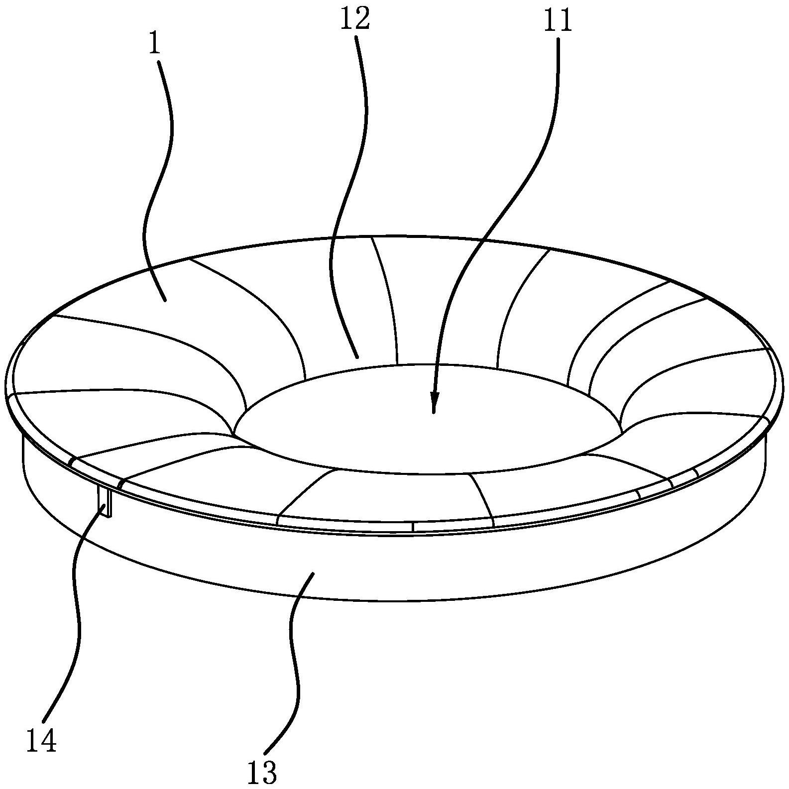 本实用新型提供了一种浇水壶壶盖,属于园艺用具技术领域。它解决了现有浇水壶壶盖在加水时不够便利的问题。本浇水壶壶盖,包括盖板,盖板上具有加水口,加水口偏心设置,盖板由外边沿向加水口边沿逐渐向下倾斜设置。本浇水壶壶盖使得加水更加方便。
