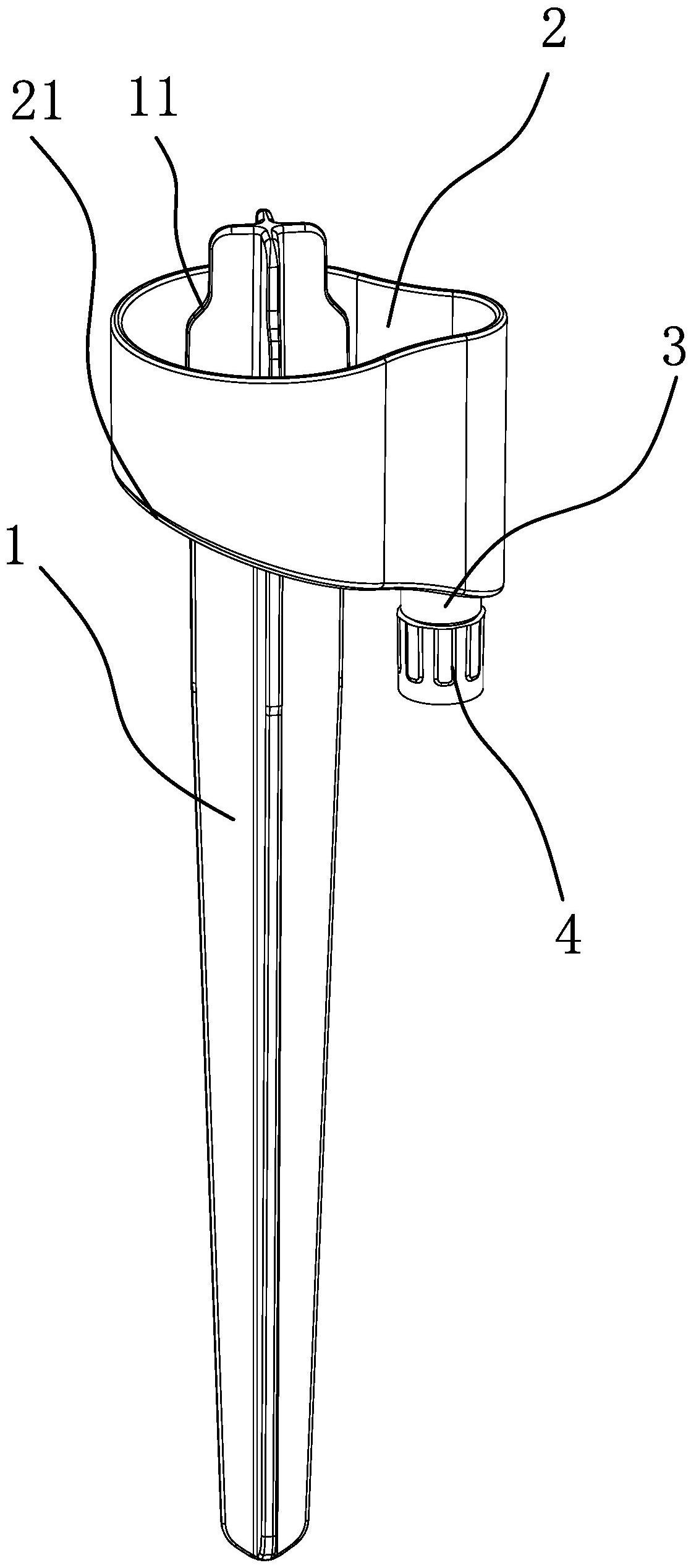 本实用新型提供了一种浇水装置,属于农业用品技术领域。它解决了现有的浇水装置的使用稳定性较差的问题。本浇水装置,包括储水罐和与储水罐底部连接的插杆,储水罐的内底面呈倾斜设置,储水罐的底部具有出水管,出水管贯穿于所述的内底面下方的位置并且其内端伸出所述的储水罐内,出水管处设有滴水阀。本浇水装置的浇水使用稳定性较好。