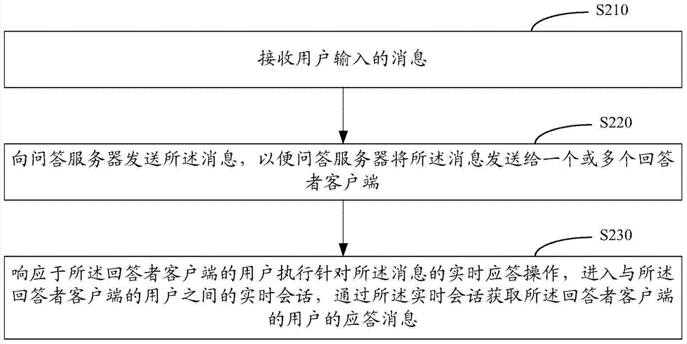 本发明的实施方式提供了一种用于问答的方法。例如,该方法可以包括:接收用户输入的消息;向问答服务器发送所述消息,以便问答服务器将所述消息发送给一个或多个回答者客户端;响应于所述回答者客户端的用户执行针对所述消息的实时应答操作,进入与所述回答者客户端的用户之间的实时会话,通过所述实时会话获取所述回答者客户端的用户的应答消息。本发明使得发问者以及回答者通过专门用于问答的客户端发出消息以及接收消息,并在回答者实时应答时,使双方进入一对一或一对多的即时会话,因此,具有很好的即时性,为用户带来了更好的体验。此外,本发明的实施方式提供了一种用于问答的装置。