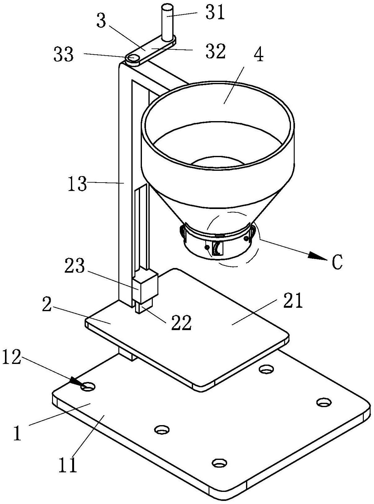 本实用新型涉及包装设备技术领域,具体的说是一种黄精制品的包装装置,包括下料斗,所述下料斗上连接有第一固定结构,所述下料斗的底部设有第二固定结构,所述第二固定结构包括固定圈,所述固定圈与下料斗之间固定连接,所述固定圈内滑动连接有限位板,所述限位板上固定连接有固定环,所述固定环与固定板之间滑动连接,所述限位板上螺纹连接有第二丝杆,所述第二丝杆与固定圈之间转动连接,加快了收纳袋的固定,大大提高了黄精制品的包装速率。