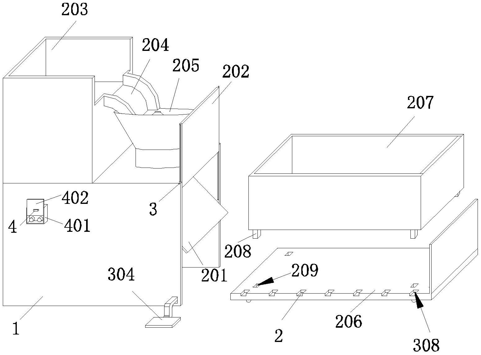 本实用新型涉及黄精加工技术领域,具体的说是一种黄精加工用切片设备,包括切片机,所述切片机上安装有放置结构,所述放置结构包括斜板,所述切片机内固定连接有斜板,所述切片机上滑动连接有滑板,所述切片机上固定连接有放料台,所述放料台侧面固定连接有导流槽,所述切片机上固定连接有放料斗,所述导流槽与放料斗抵触,所述切片机内滑动连接有推车,所述推车上放置有收纳箱,所述收纳箱底端固定连接有第一限位柱,所述推车上设有第一限位槽,所述推车与收纳箱通过第一限位柱和第一限位槽卡合;能够在切片时将黄精在放料口处放置,节省人力,同时能够将存放黄精片的箱子进行固定,防止黄精散落造成污染。