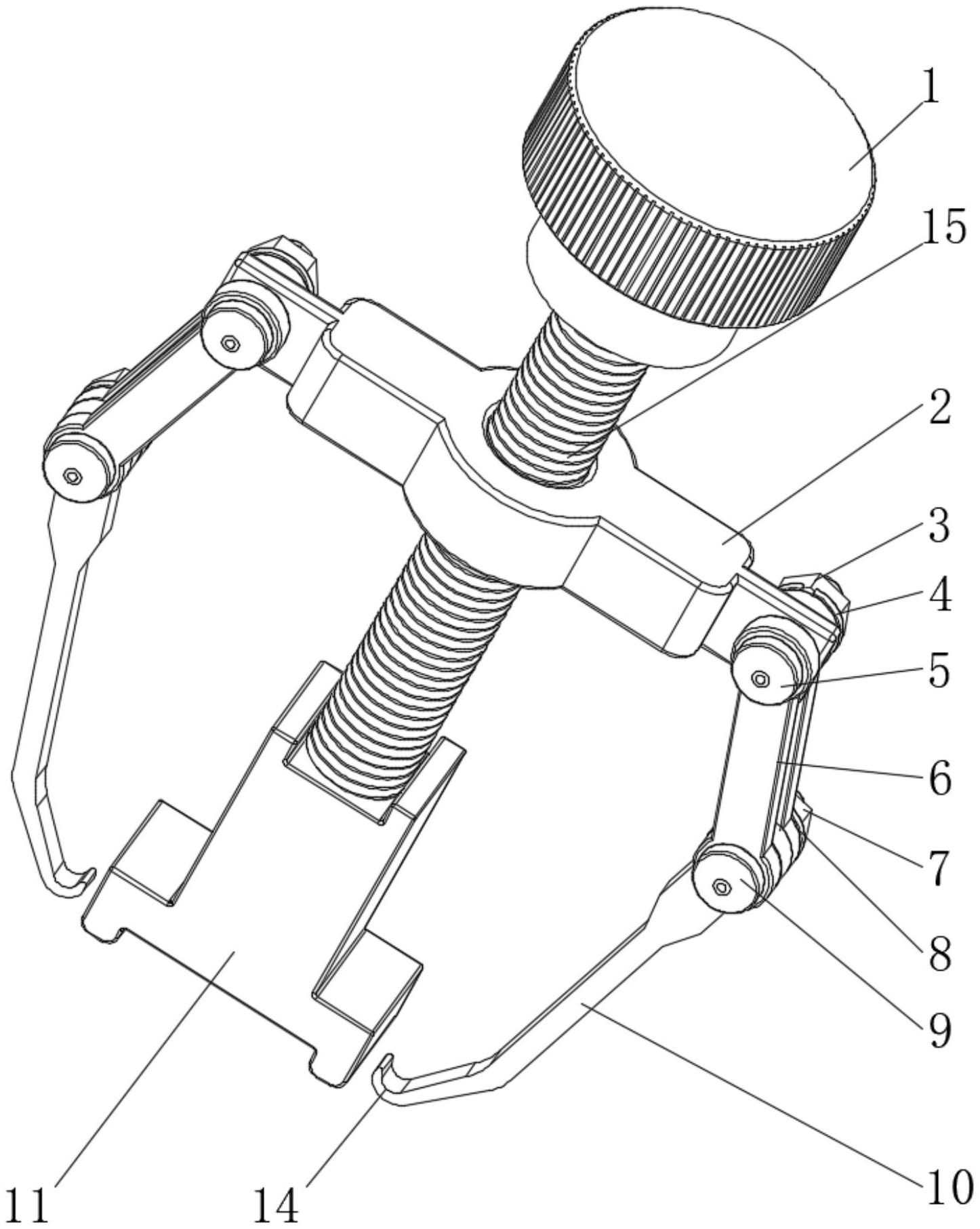 本实用新型公开了用于甲沟炎的嵌甲矫正套装,包括大螺帽,所述大螺帽的底端固定连接有传动螺杆,所述传动螺杆靠近大螺帽的一侧螺纹连接有移动杆,所述移动杆的两端均设置有中臂,两个所述中臂的底端均设置有牵引臂。本实用新型中,通过调节中臂在移动杆上的角度,以及中臂与牵引臂之间的角度,以便于该矫正装置适用于不同的指甲或趾甲,接下来,在牵引臂的固定倒钩上嵌上沾有医用酒精的一次性棉塞,接着将两侧的固定倒钩勾于指甲或趾甲的两侧,使沾有酒精的一次性棉塞嵌入指甲或趾甲的内侧,以起到消毒的作用,然后通过转动大螺帽使传动螺杆带动移动杆逐渐完成上移,从而使指甲或趾甲的两侧逐渐向上翻起,从而到达指甲或趾甲稳定矫正的目的。