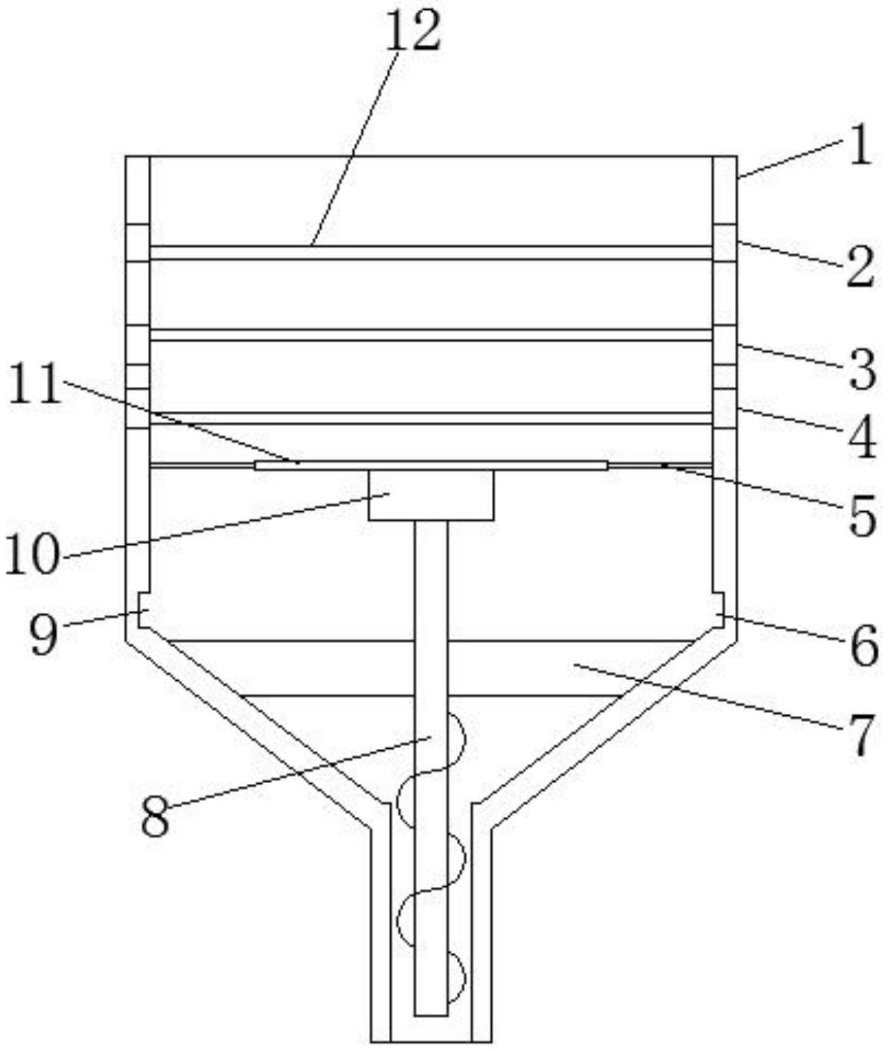 本实用新型属于豆浆粉加工技术领域,且公开了一种豆浆粉加工用螺杆下料装置,包括外壳,所述外壳的内侧设置有第一套框,所述第一套框的下方设置有第三套框,所述第三套框和第一套框之间设置有第二套框,所述第一套框、第二套框和第三套框的内侧均设置有滤网,所述第三套框的下方设置有圆盘板;通过设置的第一套框和振荡器来便于使用,设置的第一套框配合下方的两个套框能够对投入的大豆进行过滤,第一套框内侧的滤网网孔最大,从而将大豆中夹带的较大杂物拦截,中间的滤网适中,从而将上好的大豆拦截,最下方的滤网将细小大豆和沙粒拦截,从而能够去除投入大豆中夹带的杂质和不合格的细小大豆,保证后续大豆粉成品的质量。