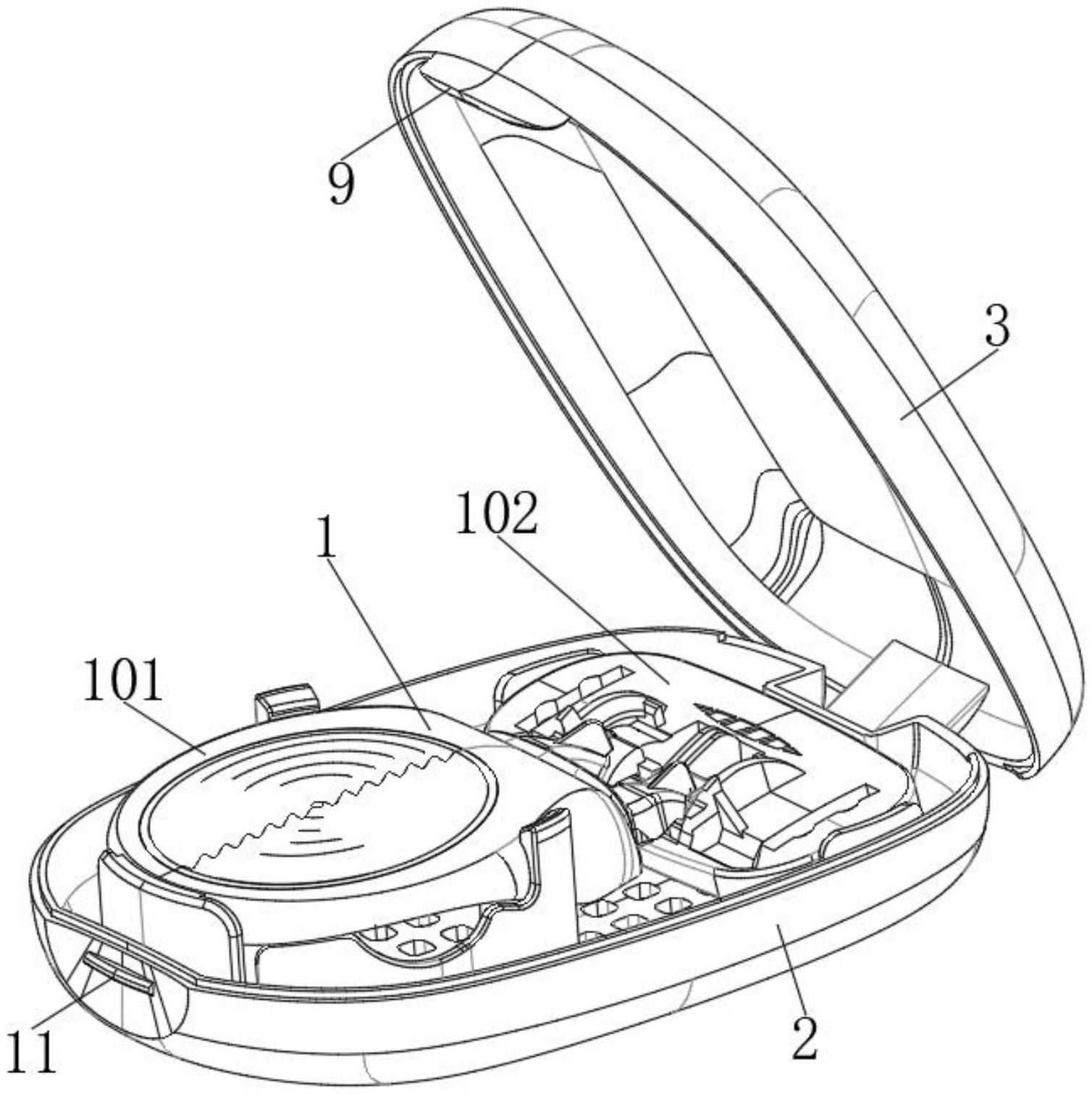 本实用新型公开了一种方便携带的剃须刀及其收纳盒,包括剃须刀本体、盒体和铰接于盒体上的盒盖,所述剃须刀本体包括手柄和剃刀头,所述盒体的底壁圆周方向固定安装有三块与手柄外形相匹配的卡板,三块所述卡板相对一侧的外表面均固定安装有用于卡紧手柄的卡块,所述盒体的底壁还对称固定安装有两块用于限位剃刀头的限位板,两块所述限位板与剃刀头的外形相匹配,所述盒体与盒盖之间设有卡接机构。本实用新型通过将剃须刀本体放入至盒体内,并使盒体底部设置的三块卡板与卡块对手柄进行固定,防止在携带时,剃须刀本体在盒体内随意晃动,对剃须刀本体表面造成划伤,影响剃须刀本体的美观。