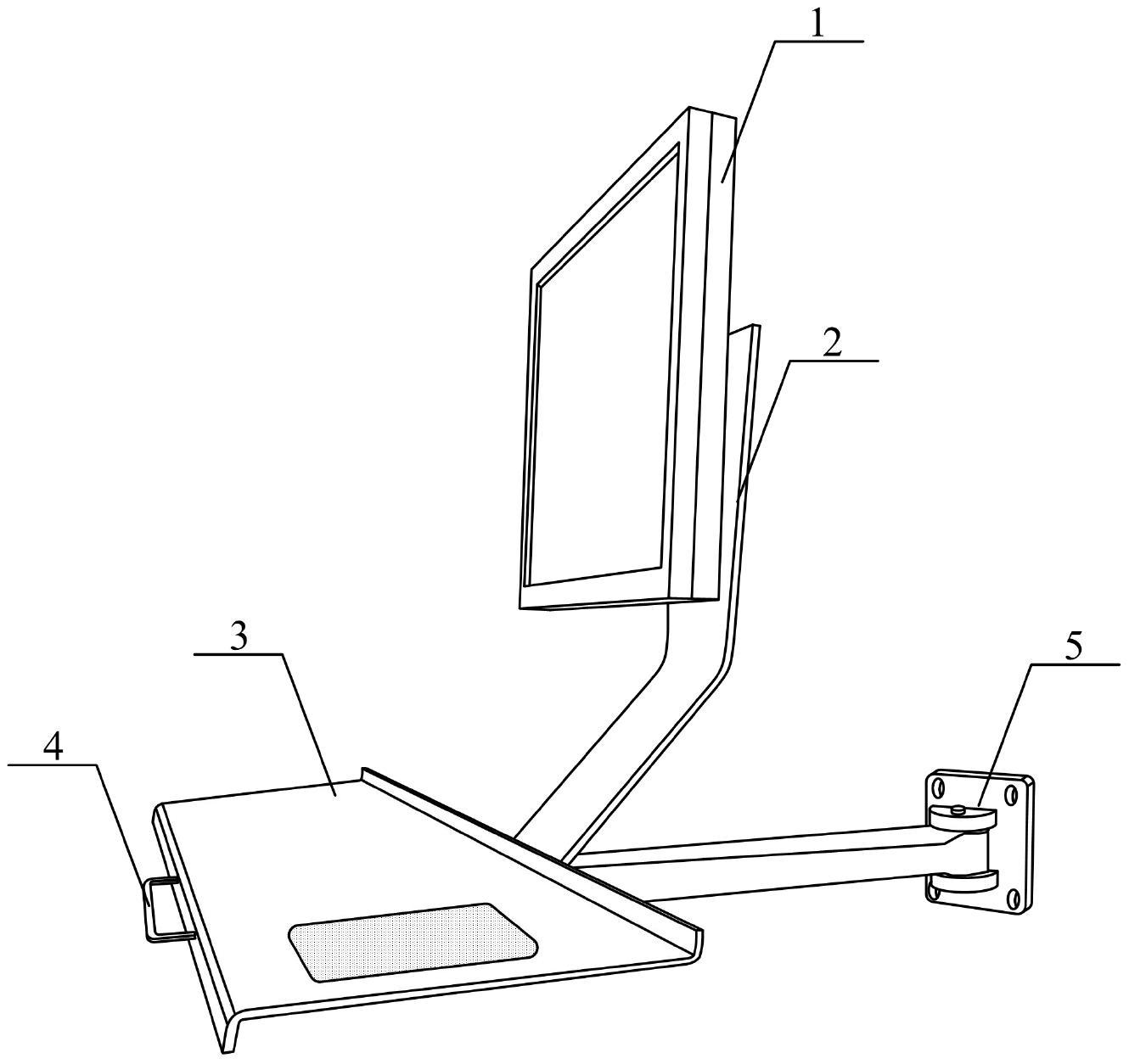 本实用新型公开了一种显示屏用悬挂支架装置,包括显示屏,显示屏支架,放置板,拉手和悬挂支架,本实用新型,通过设置显示屏支架,将显示屏垂直固定,增大显示屏与设备之间的距离,增加显示屏的散热效果;通过设置放置板,在托板上可以放置键盘和鼠标,橡胶垫能够作为鼠标垫使用,而且不会丢失;通过设置悬挂支架,悬挂臂通过转轴可以与固定支座进行180°旋转,可根据操作员的位置进行适当调整,使用十分方便;通过设置显示屏支架和悬挂支架,结构简单,便于拆卸和安装。