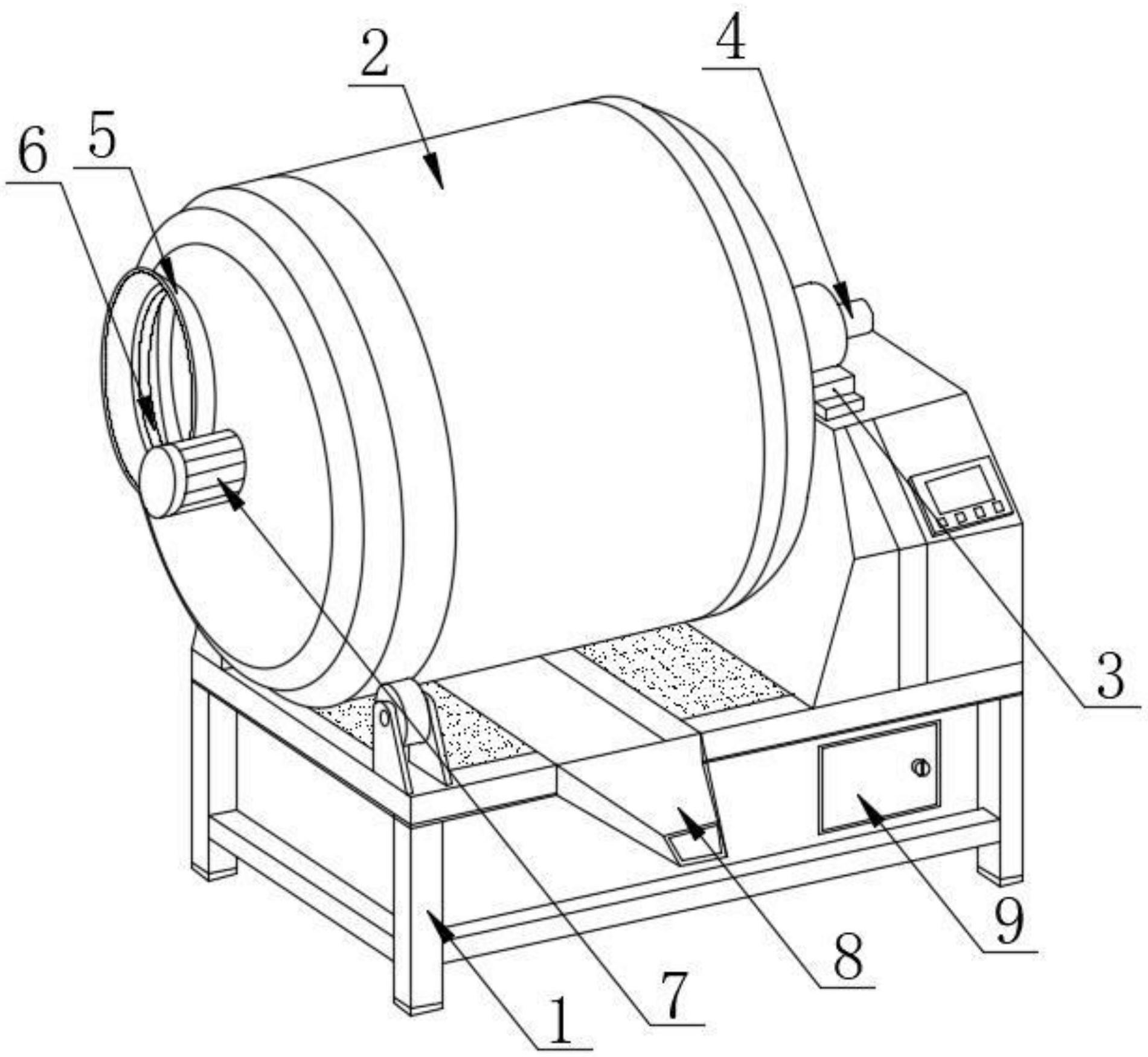 本实用新型涉及食品制造技术领域,具体为一种用于牦牛肉干腌制的高密封装置,包括装置主体,所述装置主体的顶端一侧设置腌制罐,所述装置主体的上表面对应腌制罐的一侧固定安装有轴承座,所述腌制罐的外端对应轴承座的一侧设置有连接轴,且腌制罐通过连接轴与轴承座固定连接,所述装置主体的外端一侧设置有进料口,所述进料口的内部一侧设置有密封盖,所述装置主体的外端靠近进料口的一侧固定安装有清洗电机。本实用新型所述的一种用于牦牛肉干腌制的高密封装置,能够使得整体装置更便捷的进行对腌制罐进行清洗,便于腌制罐腌制不同牦牛肉时口味更佳,提高整体装置的实用性,带来更好的使用前景。