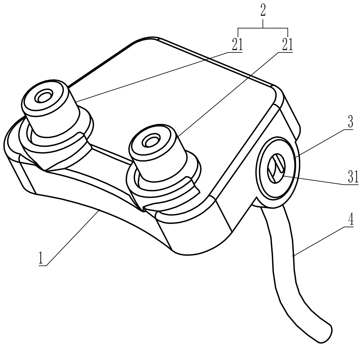 一种连接导线插座,包括壳体、连接板、金属母扣和导线。连接板固定在壳体内部,其上有两个中空柱从壳体顶面的前部向外伸出;壳体左右两侧面的后部各固定一个金属母扣,两个金属母扣为电连接;导线分别与连接板和金属母扣电连接,并从壳体底面的后部向外伸出;连接板与金属母扣相互绝缘。该连接导线插座可安装电极进行鼻炎治疗,具有拆装电极方便,降低电极更换成本的优点。