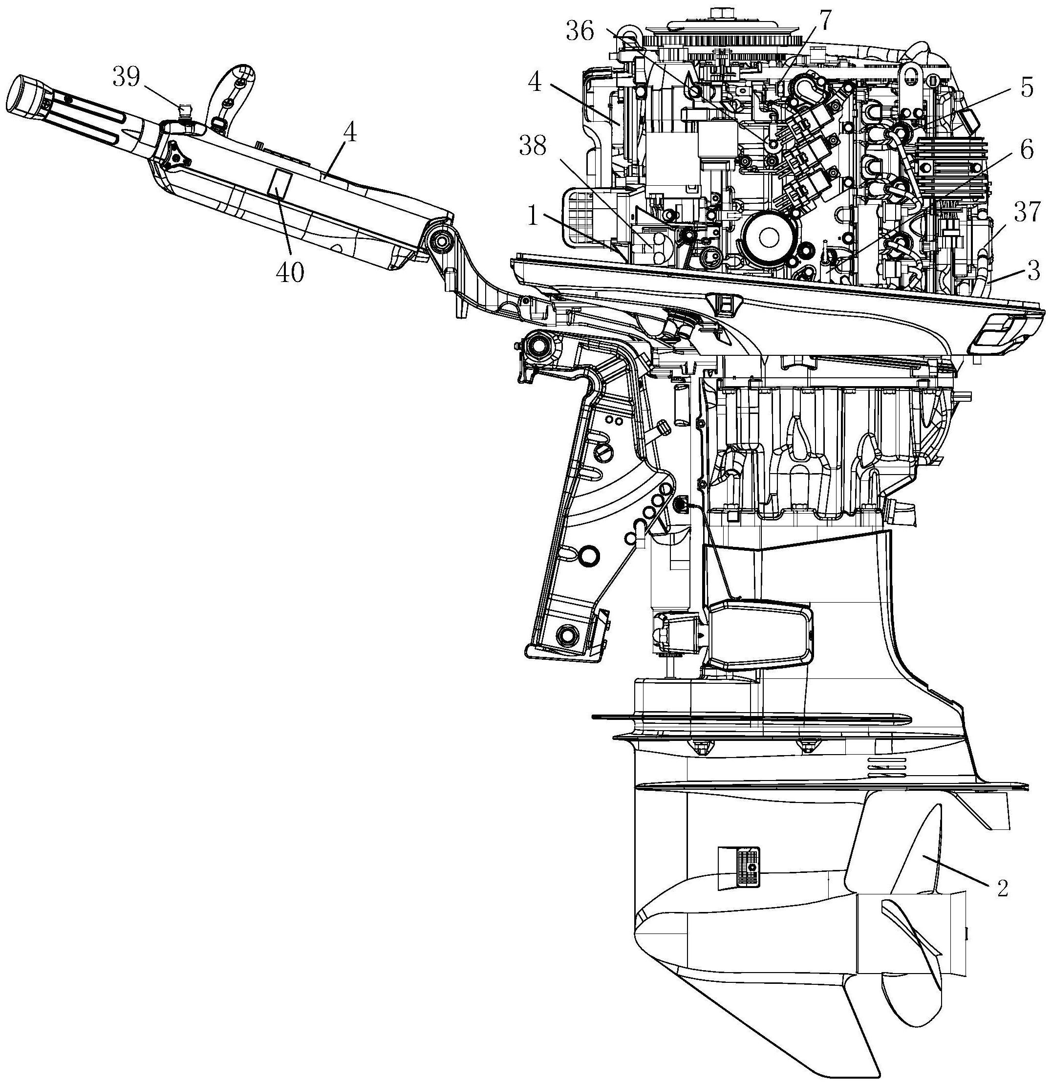 本发明涉及一种舷外机预警保护装置,包括:发动机,水下螺旋桨;发动机包括:机体,冷却水循环系统,机油润滑系统,设有燃油滤清器、电动汽油泵和喷油器的燃油系统,设有换挡拨杆、启动开关的换挡机构,预警保护装置;预警保护装置包括:装于机体上的电子控制单元、爆震传感器,装于冷却水循环系统进口端的水压力传感器,装于冷却水循环系统出口端的水温传感器,装于换挡机构上且与换挡拨杆相对的空档传感器,急停开关;爆震传感器、水压力传感器、水温传感器、急停开关、空档传感器和启动开关分别与电子控制单元电性连接。所述的舷外机预警保护装置,能及时检测发现故障,能及时进行停机检修延长发动机使用寿命。