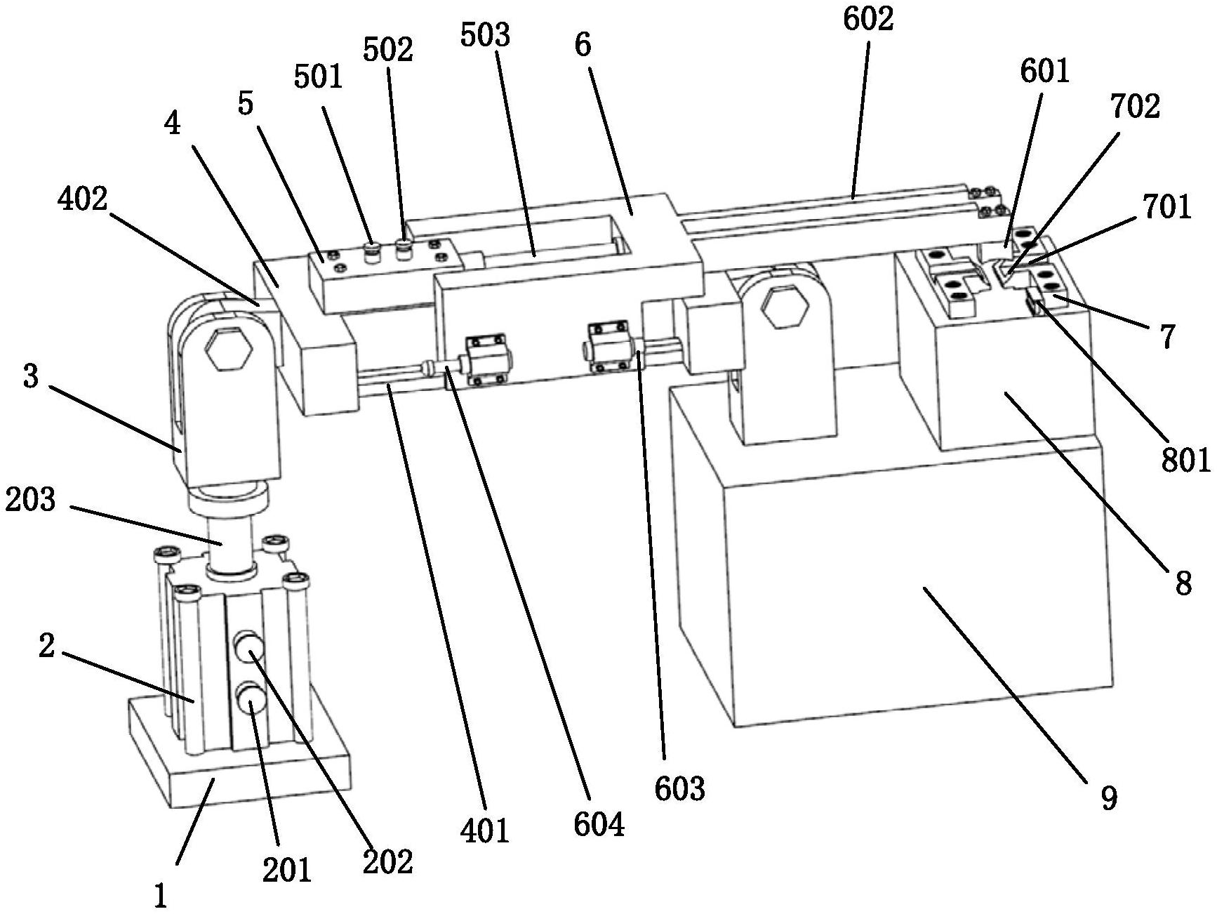 本实用新型公开了一种转子平衡机自动压紧定心装置,包括底座、升降气缸、支架杆、工形板、伸缩气缸、压板、弓形镶片、转子座和平衡机工作台。所述升降气缸竖直安装在底座上;所述支架杆共有二个,一个连接升降气缸和工形板,另一个连接工形板和平衡机工作台;所述伸缩气缸安装在工形板上面,连接压板;所述压板通过轨道置于工形板上面,压板一端安装圆弧形压紧块;所述弓形镶片安装在转子座上。本实用新型具有结构简单,实用性好,有利于提高了转子的加工效率的优点。