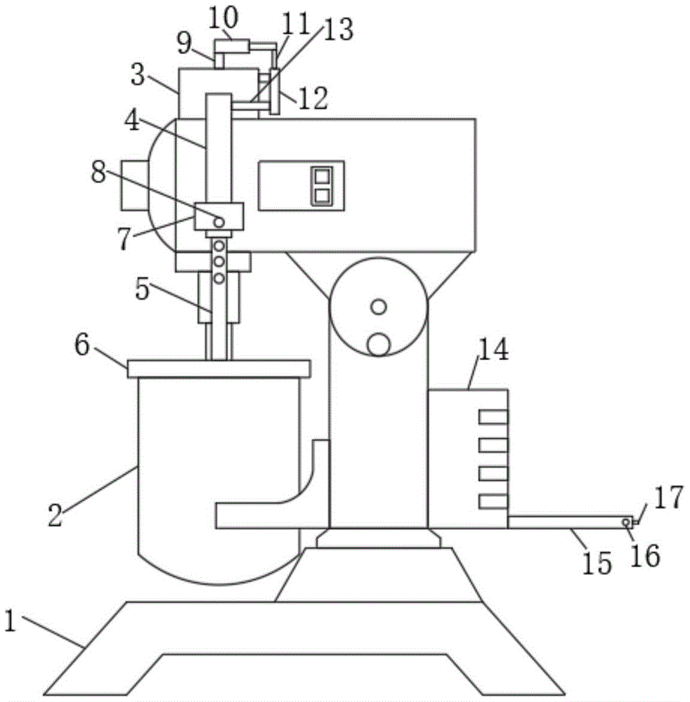 本实用新型公开了一种用于米线加工中的配料搅拌装置,包括搅拌机身及搅拌桶,所述搅拌桶位于搅拌机身的中间位置的左侧位置,所述搅拌机身的上部设置有固定块,所述固定块的前端底部及后端顶部表面分别设置有第一连接杆,所述第一连接杆的一端设置有第一固定柱,所述第一固定柱的底端设置有第一移动柱,所述第一移动柱的底部设置有遮挡盖,所述第一固定柱底端位于第一移动柱上侧位置的外侧设置有固定板;此时前半圆盖及后半圆盖底部均与搅拌桶上表面处于同一平面,拉动连接板将第一连接杆复位,搅拌机工作搅拌配料避免外物杂质进入搅拌桶内部,将数据线放入放置盒内部并环绕在绕线柱外侧避免被踩踏。