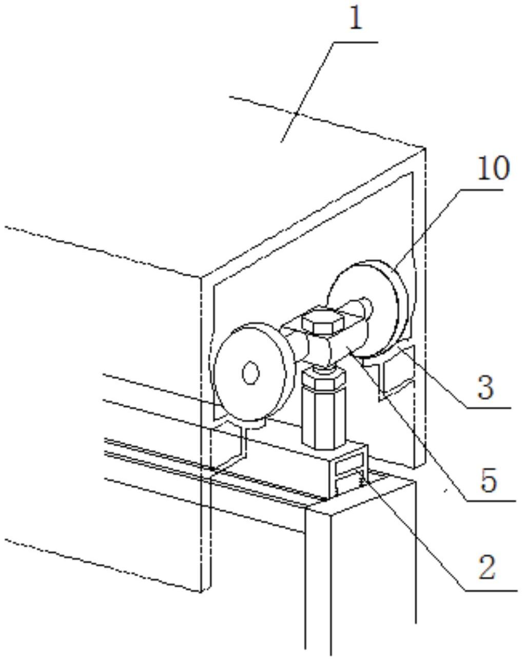 本实用新型属于推拉门技术领域,尤其是一种双滑轮安装在双轨道型材上的结构,针对现有的安装繁琐、维修不便且维修费用高的缺点,而提出如下方案,其包括上梁和门上材,所述上梁的两侧内壁上均固定安装有轨道架,门上材的顶侧转动安装有调节螺母,调节螺母内螺纹安装有螺母柱,螺母柱的顶端延伸至调节螺母外并固定套接有轮架,轮架的底侧沿竖直方向开设有安装孔,螺母柱的顶端贯穿安装孔并固定安装有螺钉,轮架的两侧均固定安装有转动座,两个转动座相互远离的一侧均转动安装有轮轴。本双滑轮安装在双轨道型材上的结构设计,大大降低了安装成本和缩短了安装时间,不需设置天花板,更谈不上预留维修孔,维修方便,满足了使用需求。