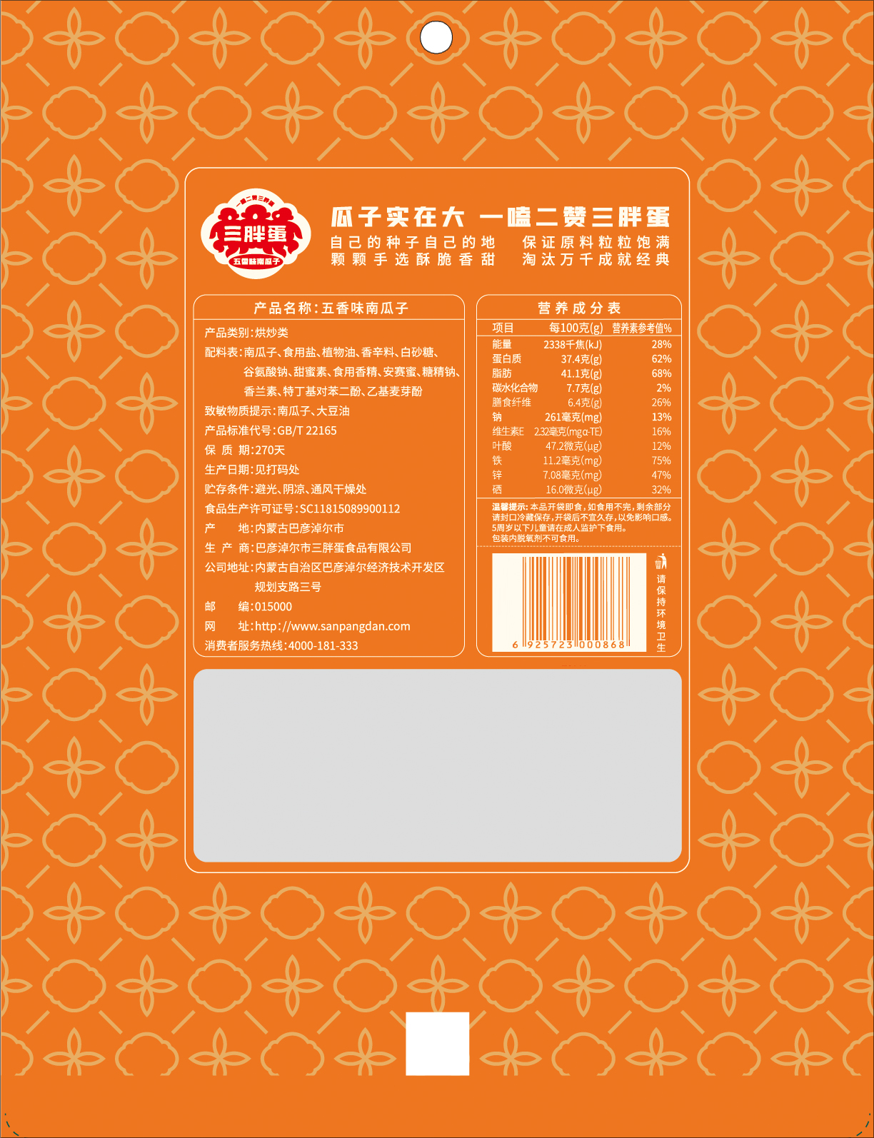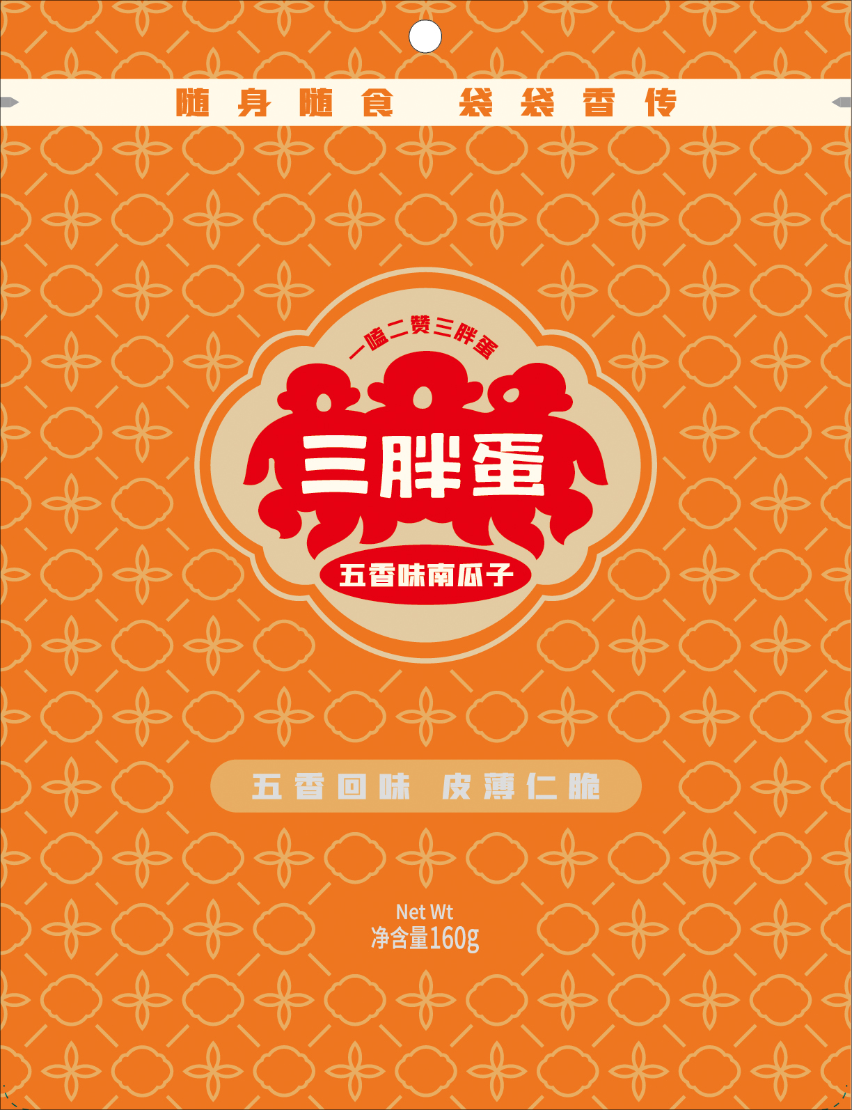 1.本外观设计产品的名称:南瓜子包装袋(五香味160g)。2.本外观设计产品的用途:包装南瓜子。3.本外观设计产品的设计要点:在于形状与图案的结合。4.最能表明设计要点的图片或照片:主视图。5.本外观设计产品为薄型产品,省略俯视图、仰视图、左视图、右视图、立体图。