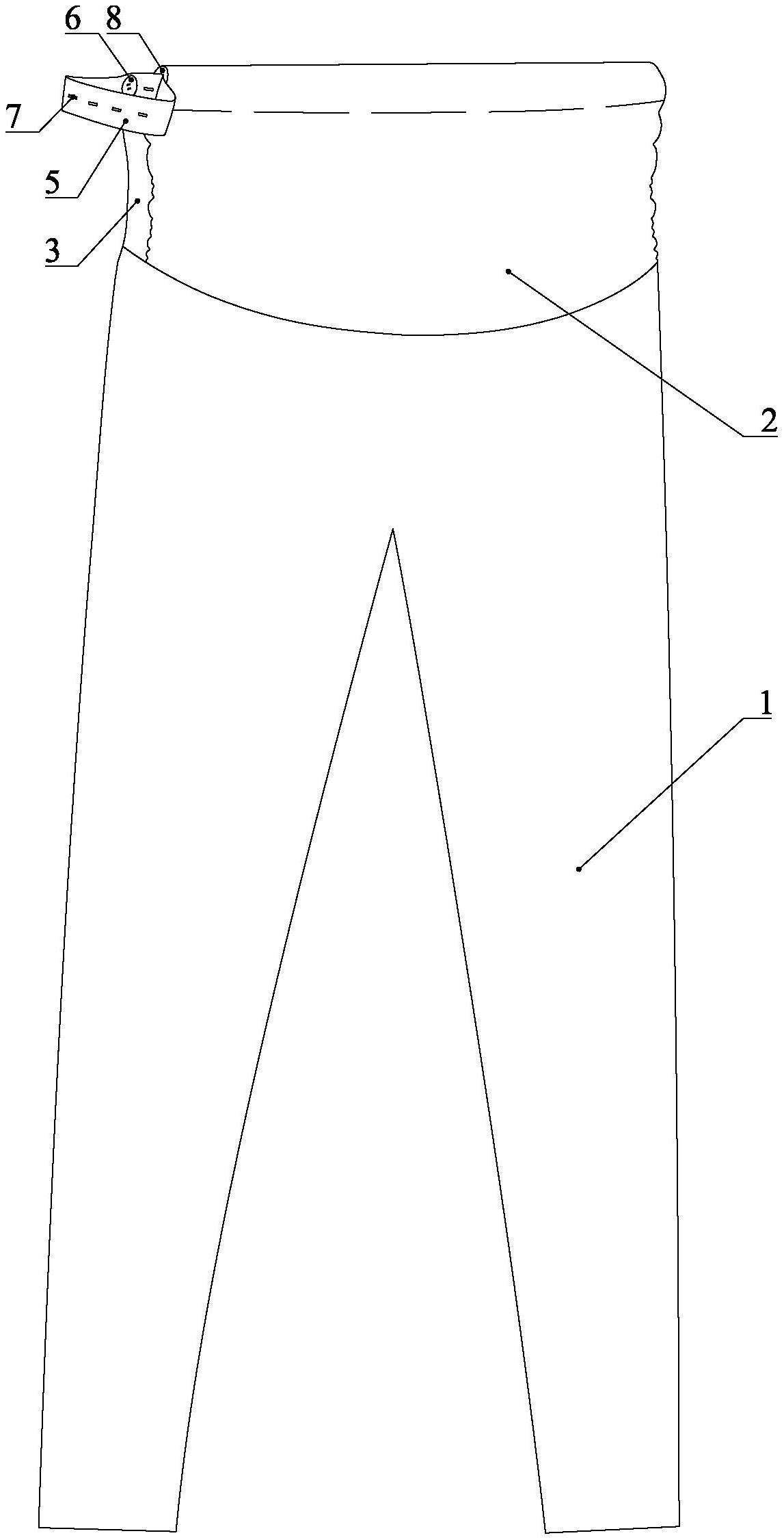 本实用新型属于服装技术领域,特指一种孕妇裤,包括裤体和连接在裤体上端的托腹体,所述托腹体包括位于前侧的托腹部和位于后侧的托腰部,所述托腰部的顶端设有弹力腰带,弹力腰带两端分别固定连接在托腹体上,所述托腹部的顶端内侧设有用于调节托腹部顶端收紧程度的收紧带,所述收紧带部分伸出托腹部,所述托腹体和收紧带上设有固定收紧带伸出部分的收紧带固定结构。本实用新型对孕妇腰部的束缚力小,穿着舒适。