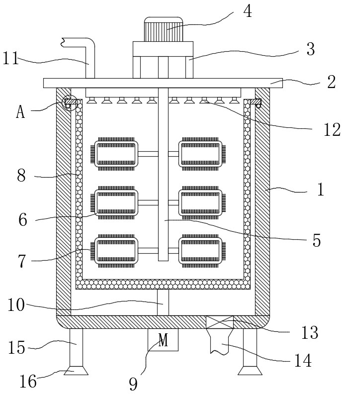 本实用新型公开了一种食品加工用清洗搅拌机,包括搅拌桶,所述搅拌桶上固定连接有盖体,所述盖体上固定连接有支架,所述支架内固定连接有第一电机,所述第一电机的输出端固定连接有搅拌轴,所述搅拌轴穿过盖体并转动连接在搅拌桶内,所述搅拌轴上设有搅拌清洗装置,所述搅拌桶的底部固定连接有第二电机,所述第二电机的输出端固定连接有转轴,所述转轴的一端穿过搅拌桶的底部并固定连接有滤筒,所述滤筒上设有支撑装置。本实用新型通过第一电机带动搅拌轴转动,从而使得搅拌叶以及清洁刷转动对搅拌桶内的物料进行清洗搅拌,同时第二电机带动转轴转动,从而使得滤筒与搅拌轴反方向转动,从而使得清洁效率更高。
