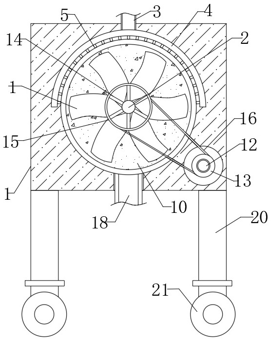 本实用新型公开了一种食品加工用循环换气的负压式风机,包括固定框,所述固定框的外侧壁固定连接有动力机构,所述动力机构通过连接机构连接有第二转轴。本实用新型通过动力机构、连接机构、第二转轴、负压扇叶和限位块的配合作用,这样利用电机带动第一转轴转动,第一转轴通过皮带的作用带动第二转轴转动,从而带动负压扇叶转动进行循环换气,通过第一防尘网、万向轮、第二防尘网、进液管、出水管、出料管和连接板的协同作用,这样利用第一防尘网和第二防尘网将灰尘和杂物隔离在外部,当负压风机不运行时,打开进液管,利用清洗水对第一防尘网进行清洗,废液和灰尘从出料管排出,同时利用万向轮便于操作者搬运负压风机。