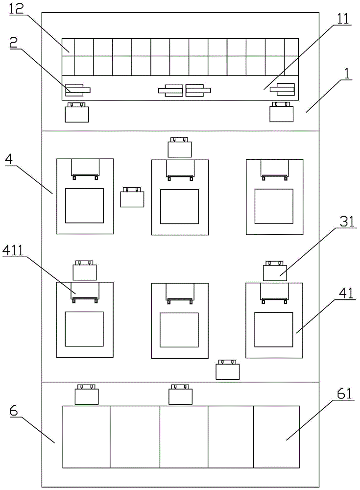 本发明涉及服装加工技领域,公开了一种高自动化服装生产系统,包括用于收纳面料和配饰的备料单元、用于根据工艺要求选择面料和配饰的选取单元、用于传输的多辆运料车以及将面料和配饰加工成成衣的加工单元,运料车上安装有用于承接选取单元选取的物料以及加工单元加工的成衣的横板,加工单元包括带有不同缝纫设备的多个工作台,工作台上安装有将承载成衣的横板推出的下料组件。本方案通过设置备料单元将物料有序放置,并利用选取单元将对应的物料放置在横板上,再通过运料车将物料传输至工作台上加工;由于不同工作台上带有不同的缝纫设备,运料车使不同的加工工序得以同步进行,达到了同时进行多样化加工的目的,提高了生产效率。