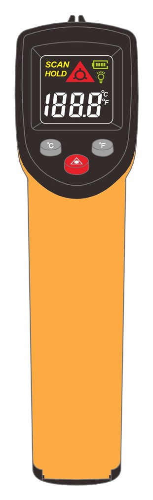 1.本外观设计产品的名称:带开机状态图形用户界面的红外线测温仪。2.本外观设计产品的用途:用于快速测量各种高温、有毒或难于接触的物体表面温度。3.本外观设计产品的设计要点:在于图形用户界面的内容。4.最能表明设计要点的图片或照片:设计1主视图。5.无设计点,省略设计1的后视图、左视图、右视图、俯视图、仰视图;省略设计2的后视图、左视图、右视图、俯视图、仰视图。6.指定设计1为基本设计。7.图形用户界面的用途:本图形用户界面为红外线测温仪的交互界面;其中,设计1主视图所显示的界面为红外线测温仪开机状态下的显示界面;设计2主视图所显示的界面为红外线测温仪开机状态下的显示界面。