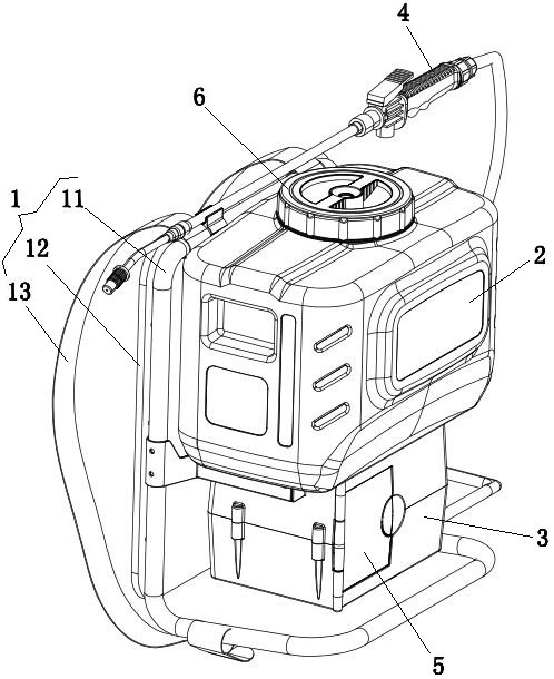 本实用新型公开了一种肩背式喷雾器,涉及一种通过电池包供电而自动供液和电动均衡喷洒药液,从而实现消杀等工作的喷雾器,其结构包括背靠组件、水箱、电池包、电动水泵和喷杆等,主要是将作为喷雾器供电电源的电池包采用锂电池包,并且该电池包单独内置在水箱底部的电池盒内,并在电池盒上设有可开启或关闭的门盖,以供电池包的装入或取出。由于喷雾器是采用可拆式安装的锂电池作为电池包,故能单独拿出进行充电,不但充电过程简单,而且远离了充满药液的水箱后使得充电过程也更加安全;同时,可拆卸的锂电池包维修和更换相当方便、省力,使用寿命更长,即使锂电池包在损坏废弃后,相比传统的铅酸蓄电池对环境污染的影响也更小。