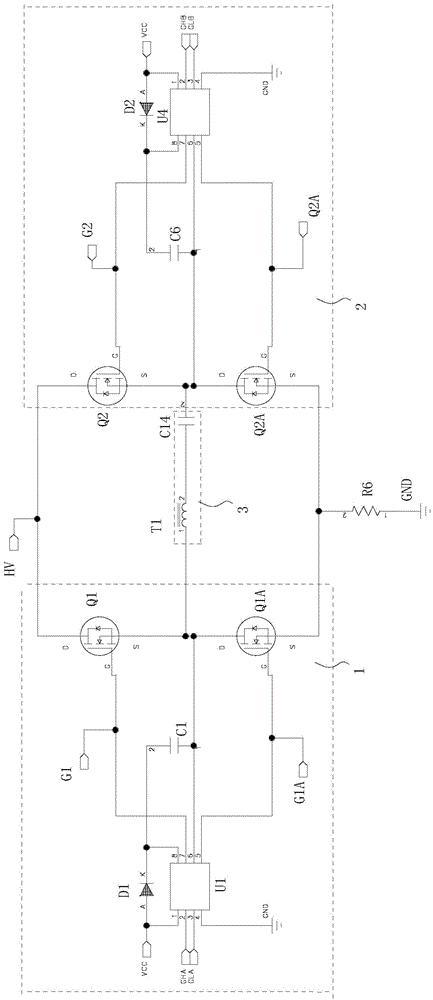 本实用新型涉及电力电子技术领域,具体涉及一种双电压自动切换的转换电路,包括识别模块、PWM控制模块以及半桥和全桥转换模块;所述半桥和全桥转换模块包括第一桥臂和第二桥臂;所述第一桥臂包括第一驱动模块、第一开关管以及第二开关管;所述第二桥臂包括第二驱动模块、第三开关管以及第四开关管;还包括负载模块,所述负载模块连接于第一开关管与第二开关管的公共连接端以及第三开关管与第四开关管的公共连接端之间。本实用新型通过设置识别模块、PWM控制模块、半桥和全桥转换模块以及负载模块,能够根据输入电压的大小,从而半桥和全桥转换模块自动在半桥状态以及全桥状态转换,从而同时兼容220V以及110V电压。