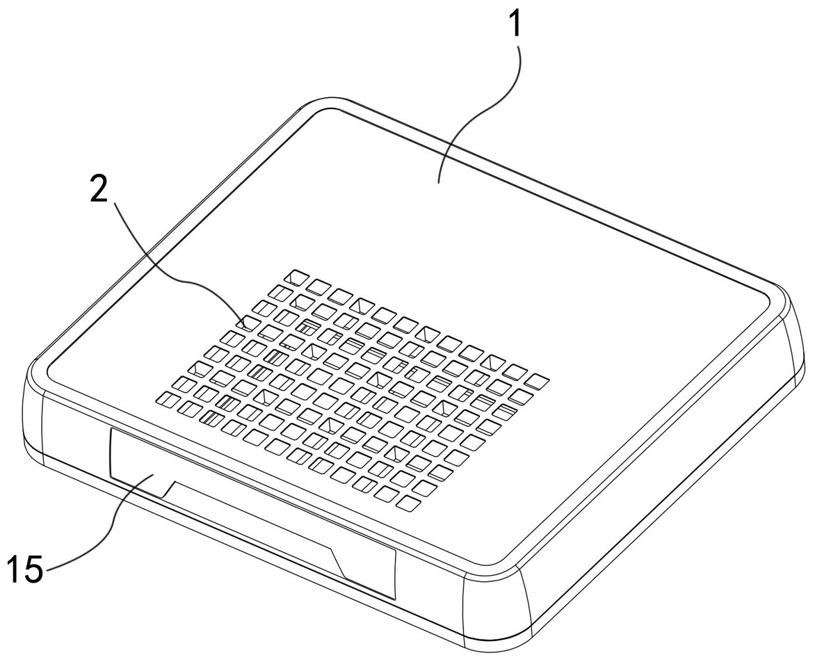 本实用新型公开了一种吸尘器,包括方形的盒体,该盒体内部中空形成有安装腔,在盒体的顶部面板上开设有若干吸尘口,这些吸尘口呈方形阵列分布在盒体的顶部面板上,外部的灰尘由吸尘口吸入安装腔中,安装腔被分隔成负压腔和尘腔,尘腔位于吸尘口的下方,在尘腔中设置有过滤网,用于收集、过滤粉尘,负压腔用于形成负压将外部夹带着粉尘的气流吸入,尘腔和负压腔相互连通,经过滤网过滤后的气流进入到负压腔中,再从盒体底面板上的散热孔中排出。