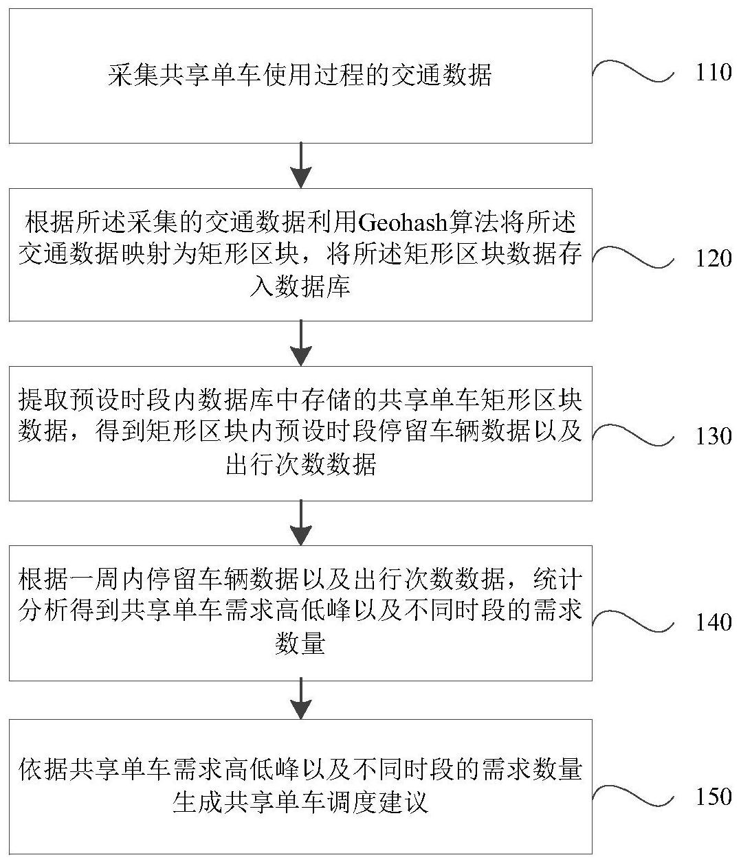 本发明公开了一种基于大数据的共享单车管理方法及系统,所述方法包括:采集共享单车使用过程的交通数据;根据所述采集的交通数据利用Geohash算法将所述交通数据映射为矩形区块存入数据库;提取预设时段内数据库中存储的共享单车矩形区块数据,统计分析得到共享单车需求高低峰以及不同时段的需求数量;采用聚类算法得到群聚信息和重要站点,生成共享单车调度建议和维护建议、电子围栏构建建议;所述方法基于用户单车数据进行单车出行分析,同时结合理论模型和算法的支持,保证分析结果的有效性以及提供调度建议的合理性;完成站点的重要性排序分析,既为维护者提供重点维护建议,也可以为政府提供电子围栏设置区域的建议。