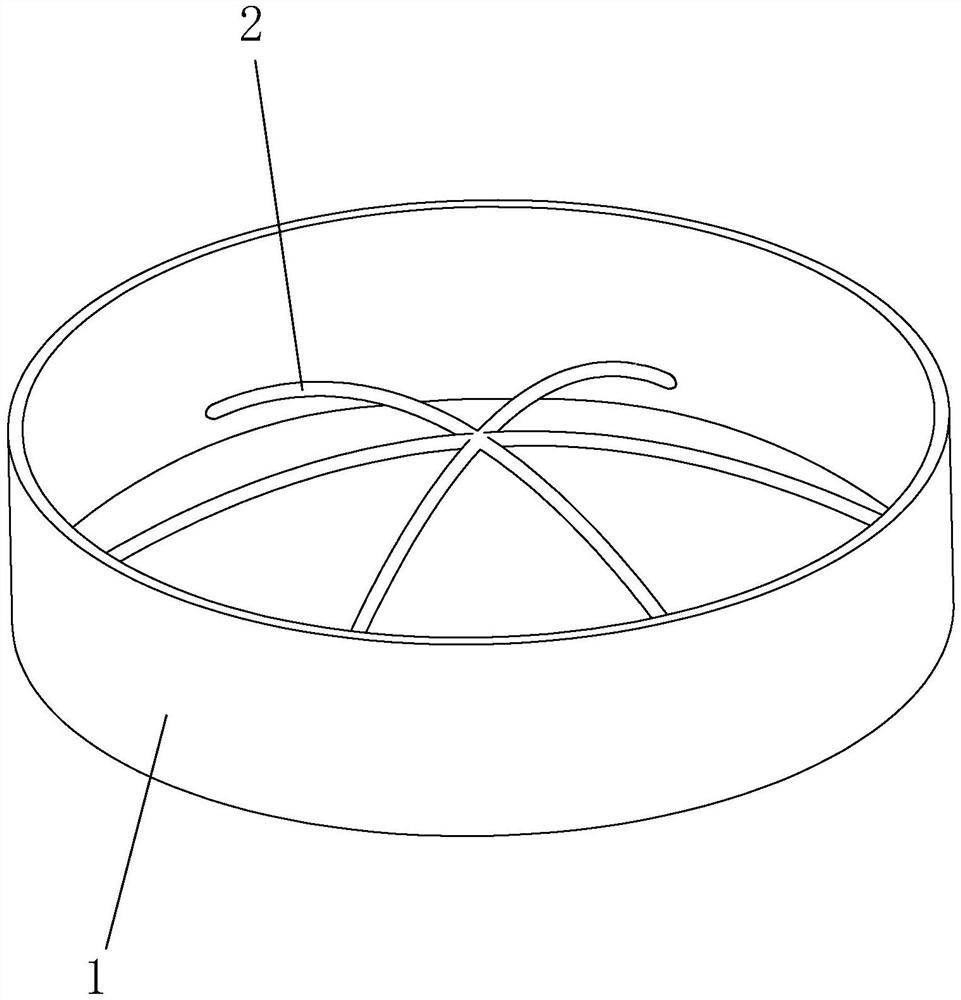 本实用新型公开一种南瓜包模具,包括主体和设于模具上的压花件,所述主体为中空的圆柱形结构,所述压花件由至少三段开口向下的刚性弧形细丝相交组成,多段细丝的交点与主体的轴心位于同一竖直线;本实用新型通过在圆柱形主体上设置由多段细丝相交组成的压花件,使得加工人员在制作南瓜包时,仅需将生坯面团揉成球形,放入主体中使压花件在其表面压出南瓜纹路即可。该模具结构简单,可配合人工或者机械手使用,实现低成本、高效率。