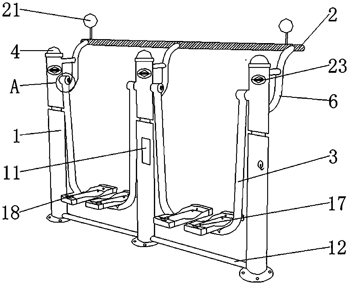 本实用新型公开了一种公园新型漫步机,包括空心柱和摆动杆,所述空心柱内侧靠上部的位置通过转动连接有摆动杆,所述空心柱顶部的外表面套接有护套,所述空心柱外表面两侧的中心位置均固定连接有挂钩,所述空心柱内部的中心位置套接有伸缩筒,所述空心柱正面的上部卡接有伸缩筒开关,所述空心柱正面的中心位置通过螺栓连接有使用说明板,所述空心柱顶部的上表面套接有半圆盖,所述空心柱的底部贯穿连接有水平的底座连接杆,所述空心柱背面靠上部的位置焊接有S型杆。本漫步机采用了直埋式安装,节省了占地面积,且脚踏板设有夜光标,夜晚使用时不易发生踏空的危险,提高了使用者在室外运动时的安全。