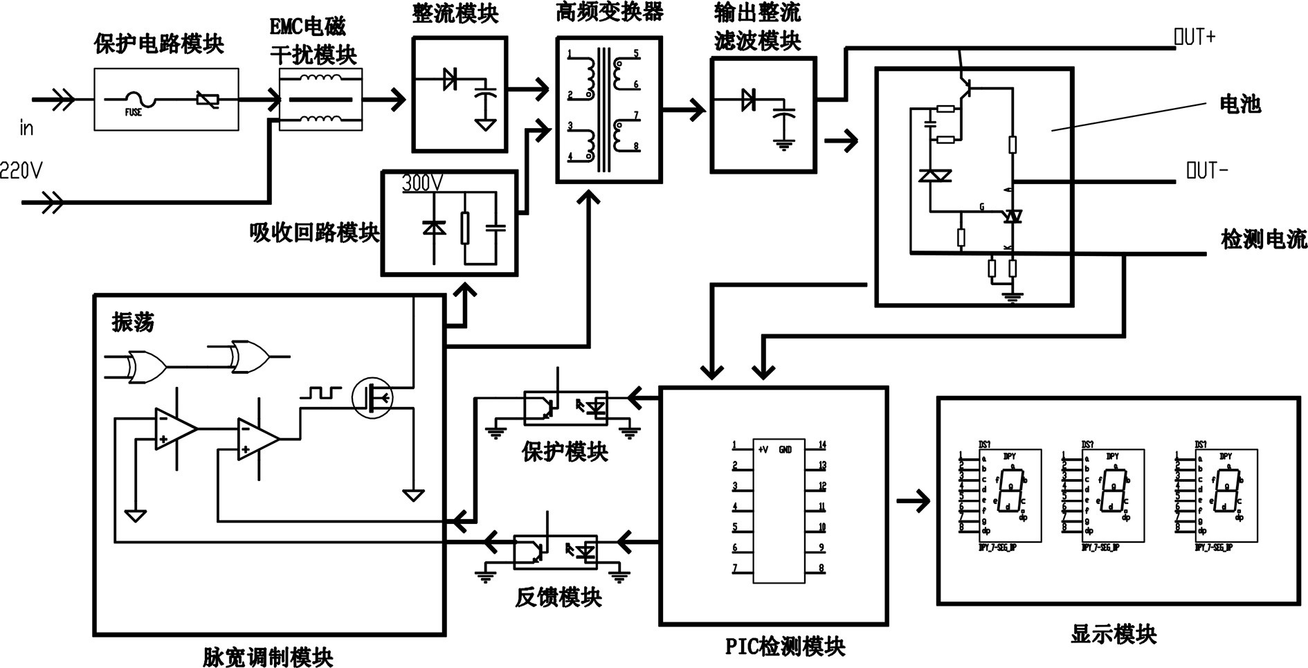 本实用新型公开了一种智能充电器,其包括PIC检测模块、脉宽调制模块、整流模块、高频变换器和输出整流滤波模块,交流电压连接到整流模块,整流模块电连接到高频变换器,高频变换器电连接到输出整流滤波模块,输出整流滤波模块电连接到电池,电池电连接到PIC检测模块,PIC检测模块电连接到脉宽调制模块,脉宽调制模块电连接到高频变换器。本实用新型的效果有:用pic检测电量来控制恒流充电;用软件检测锂离子电池的电量,用数据实时显示充电电压,安全稳定,环保节能。