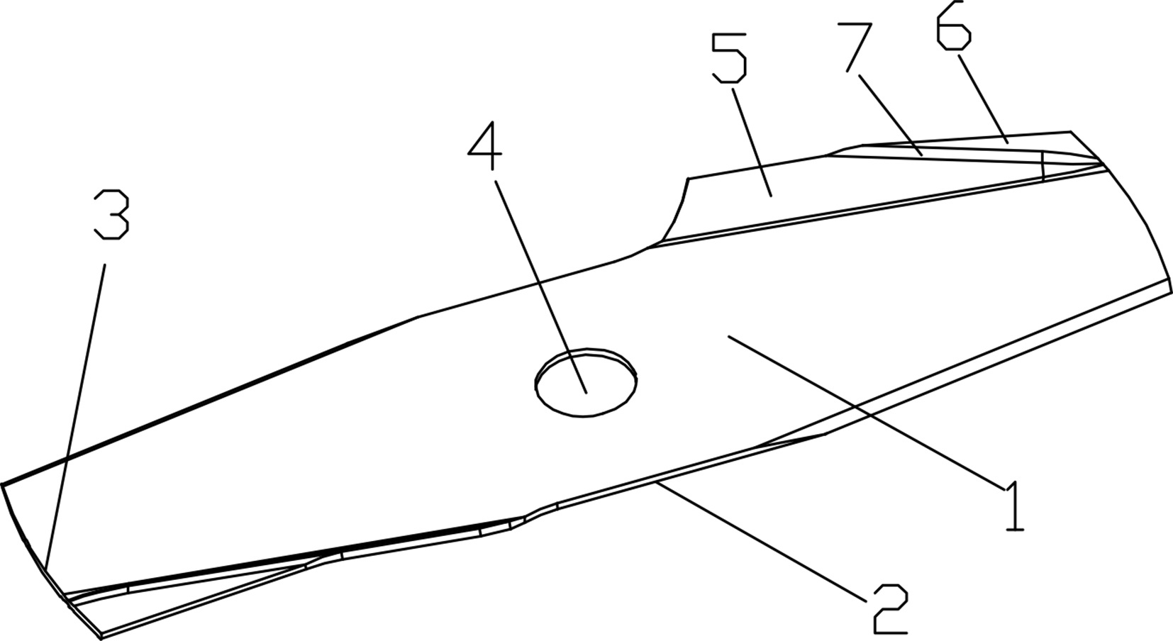 本实用新型公开了一种用于割草机上的悬浮式刀片,其包括刀片主体,刀片主体由两条长边和两条短边组成,刀片主体的中间开有安装孔,刀片主体通过安装孔安装在割草机的杆件部分上,刀片主体的两个长边上的各连接一块斜板,两块斜板对角设置。本实用新型的有益效果有:使用可悬浮刀片,可以让机器在使用过程中,利用刀片本身的转动,产生向上的浮力,从而托起杆件部分,操作者双手只是稍稍用力即可控制割草高度和方向,大大减轻操作者双手对杆件部分自身的承重,从而让整个割草过程更轻松;只是改变刀片自身的形状,对整个割草过程安全性和刀片自身重量毫无影响和增加;让操作者更轻松提起杆件,减少了刀片与地面的接触,从而让整个割草过程更安全。