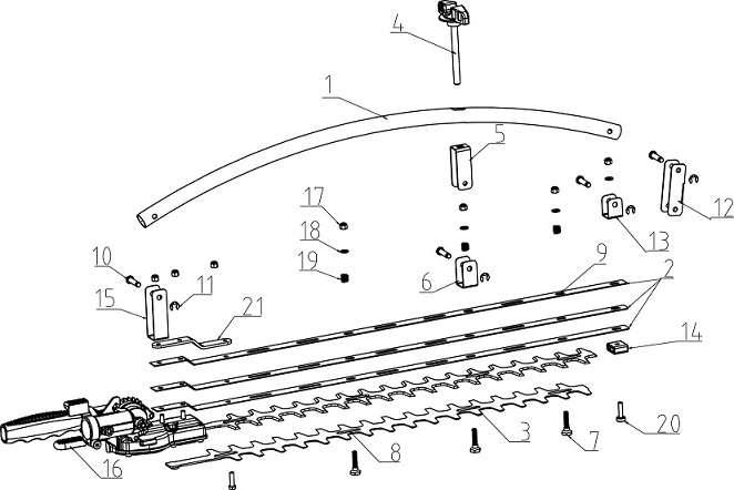 本实用新型公开了一种通用型弧度调节机构,其包括弧形管、压条和刀片,弧形管设有一个,压条设有三个,刀片设有两个,两个刀片上下叠放在一起,三个压条设置在刀片的上方,并依次叠放在一起,弧形管的两端通过连接机构与压条的端部连接,弧形管的中间位置通过调节机构与压条和刀片的中间位置连接,压条和刀片的弧度通过调节机构调节。本实用新型的有益效果有:采用适应弧度调节的多片组合式导条,结合自动调节松紧的刀片和压条的台阶螺栓结构,使得柔性刀片能够自由调节到所需弧度,满足各类场景的使用需求,结构简单,操作便捷;通用性强,可以用于改造各种类型的修剪机。